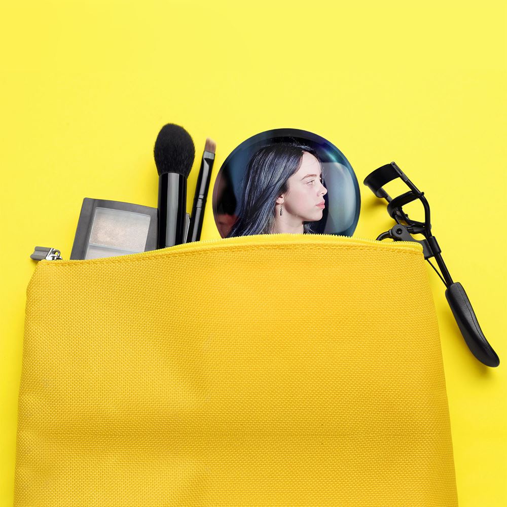 آینه های جیبی بیلی آیلیش Billie Eilish خندالو دایره ای به قطر 7.5 سانتی متر می باشد که نه خیلی بزرگ و غیر قابل استفاده در کیف آرایشی ست و نه خیلی کوچک که تصویر خاصی در آن مشاهده نشود. سایزی استاندارد و کارآمد دارد و مناسب قرار گیری در کیف لوازم آرایش و کیف های کوچک دستی نیز هست.