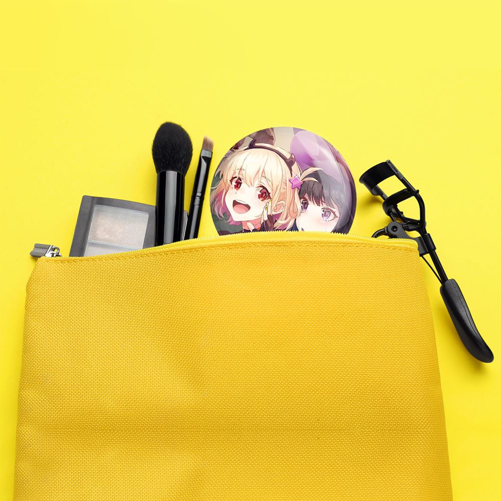 آینه های جیبی تاکینا و چیساتو انیمه لیکوریس ریکویل Lycoris Recoil خندالو دایره ای به قطر 7.5 سانتی متر می باشد که نه خیلی بزرگ و غیر قابل استفاده در کیف آرایشی ست و نه خیلی کوچک که تصویر خاصی در آن مشاهده نشود. سایزی استاندارد و کارآمد دارد و مناسب قرار گیری در کیف لوازم آرایش و کیف های کوچک دستی نیز هست.
