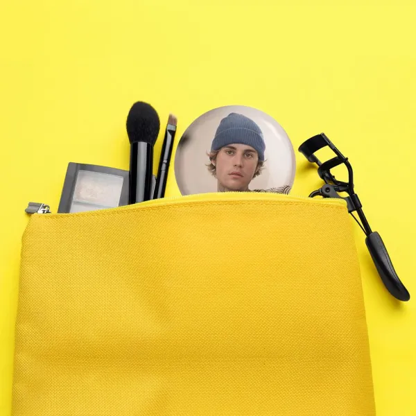 آینه های جیبی جاستین بیبر Justin Bieber خندالو دایره ای به قطر 7.5 سانتی متر می باشد که نه خیلی بزرگ و غیر قابل استفاده در کیف آرایشی ست و نه خیلی کوچک که تصویر خاصی در آن مشاهده نشود. سایزی استاندارد و کارآمد دارد و مناسب قرار گیری در کیف لوازم آرایش و کیف های کوچک دستی نیز هست.