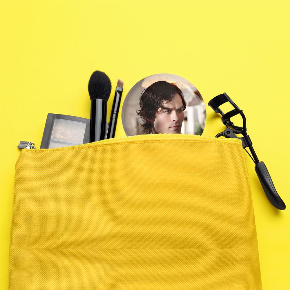 آینه های جیبی دیمون خاطرات یک خون آشام The Vampire Diaries خندالو دایره ای به قطر 7.5 سانتی متر می باشد که نه خیلی بزرگ و غیر قابل استفاده در کیف آرایشی ست و نه خیلی کوچک که تصویر خاصی در آن مشاهده نشود. سایزی استاندارد و کارآمد دارد و مناسب قرار گیری در کیف لوازم آرایش و کیف های کوچک دستی نیز هست.