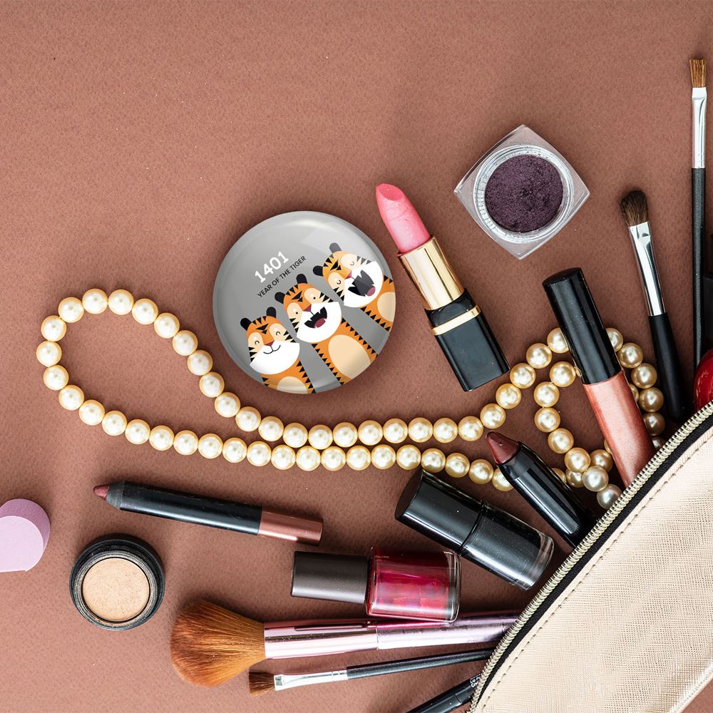 آینه های جیبی سال ببر خندالو دایره ای به قطر 7.5 سانتی متر می باشد که نه خیلی بزرگ و غیر قابل استفاده در کیف آرایشی ست و نه خیلی کوچک که تصویر خاصی در آن مشاهده نشود. سایزی استاندارد و کارآمد دارد و مناسب قرار گیری در کیف لوازم آرایش و کیف های کوچک دستی نیز هست.