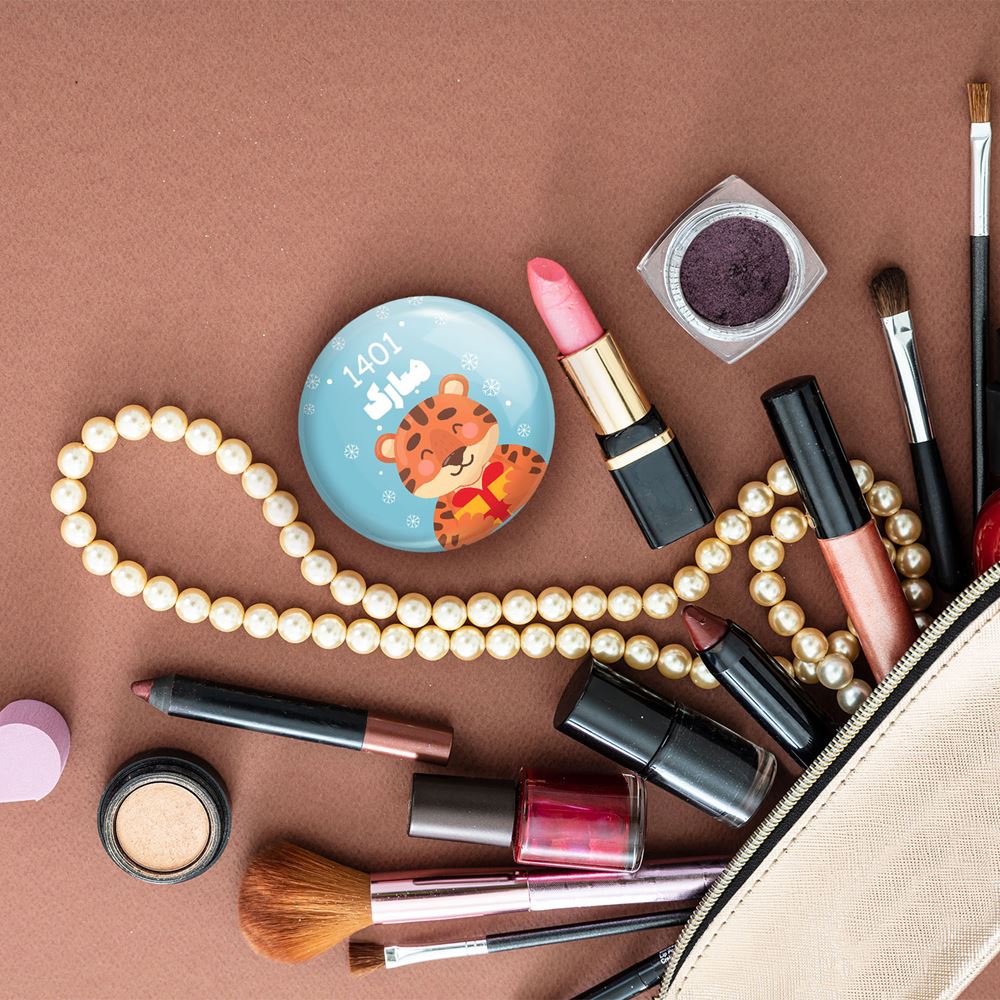 آینه های جیبی سال ببر خندالو دایره ای به قطر 7.5 سانتی متر می باشد که نه خیلی بزرگ و غیر قابل استفاده در کیف آرایشی ست و نه خیلی کوچک که تصویر خاصی در آن مشاهده نشود. سایزی استاندارد و کارآمد دارد و مناسب قرار گیری در کیف لوازم آرایش و کیف های کوچک دستی نیز هست.