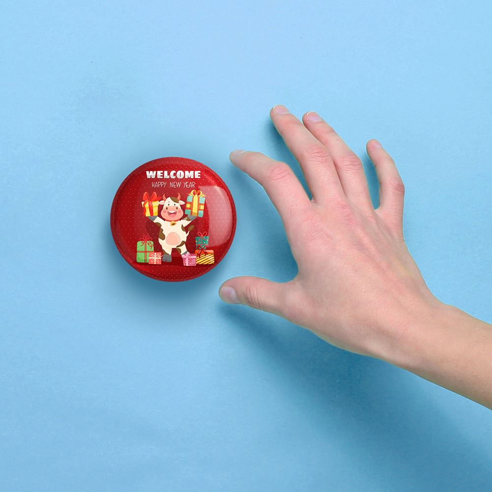 آینه های جیبی سال گاو خندالو دایره ای به قطر 7.5 سانتی متر می باشد که نه خیلی بزرگ و غیر قابل استفاده در کیف آرایشی ست و نه خیلی کوچک که تصویر خاصی در آن مشاهده نشود. سایزی استاندارد و کارآمد دارد و مناسب قرار گیری در کیف لوازم آرایش و کیف های کوچک دستی نیز هست.