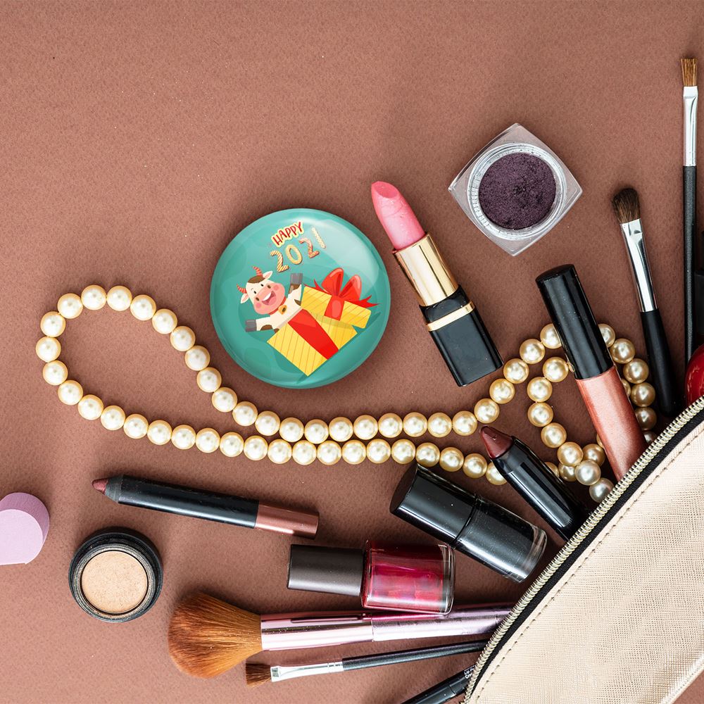 آینه های جیبی سال گاو خندالو دایره ای به قطر 7.5 سانتی متر می باشد که نه خیلی بزرگ و غیر قابل استفاده در کیف آرایشی ست و نه خیلی کوچک که تصویر خاصی در آن مشاهده نشود. سایزی استاندارد و کارآمد دارد و مناسب قرار گیری در کیف لوازم آرایش و کیف های کوچک دستی نیز هست.