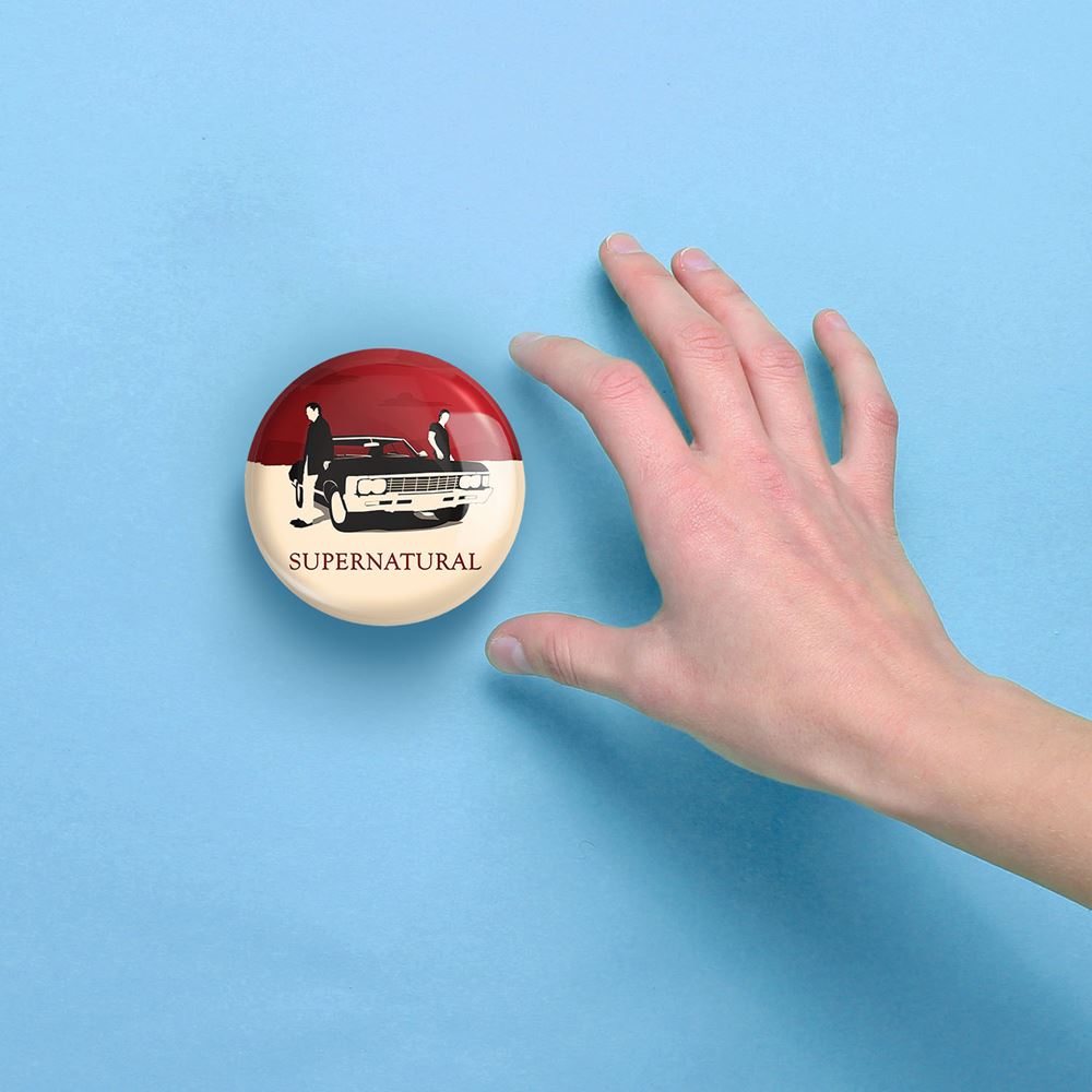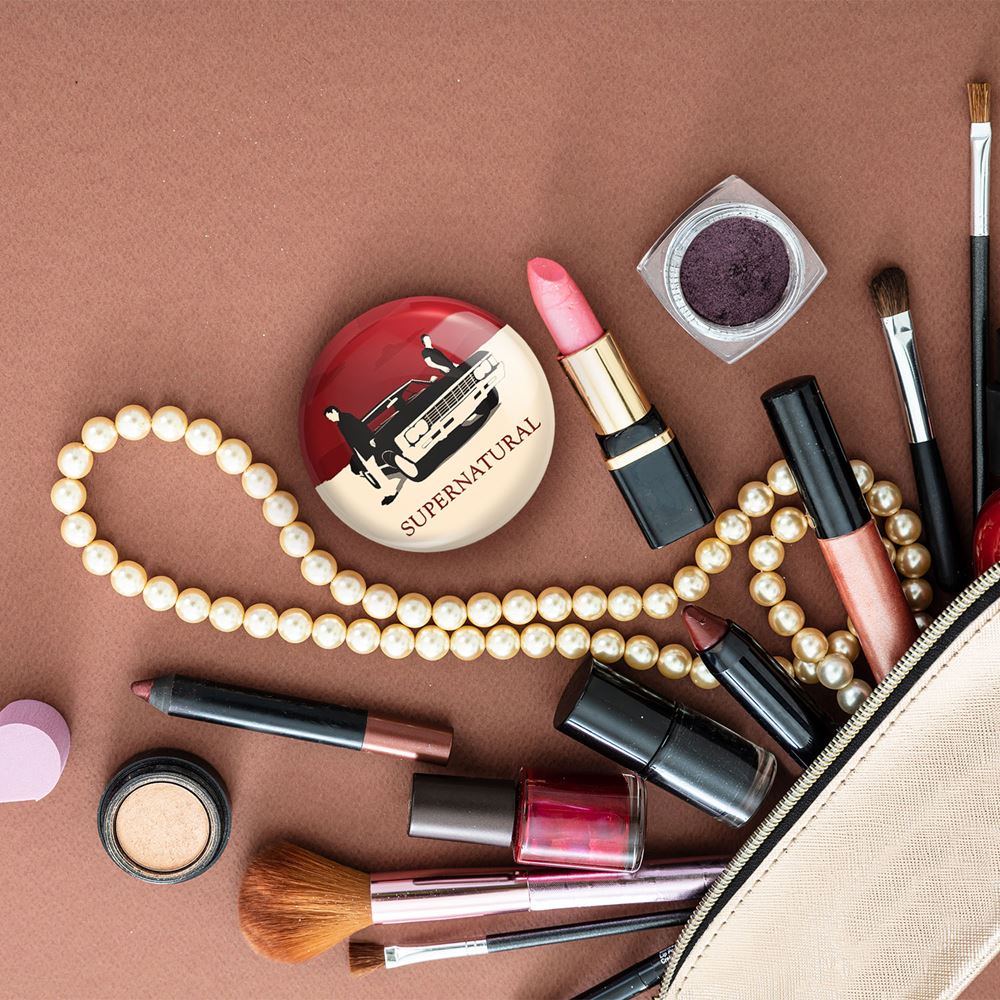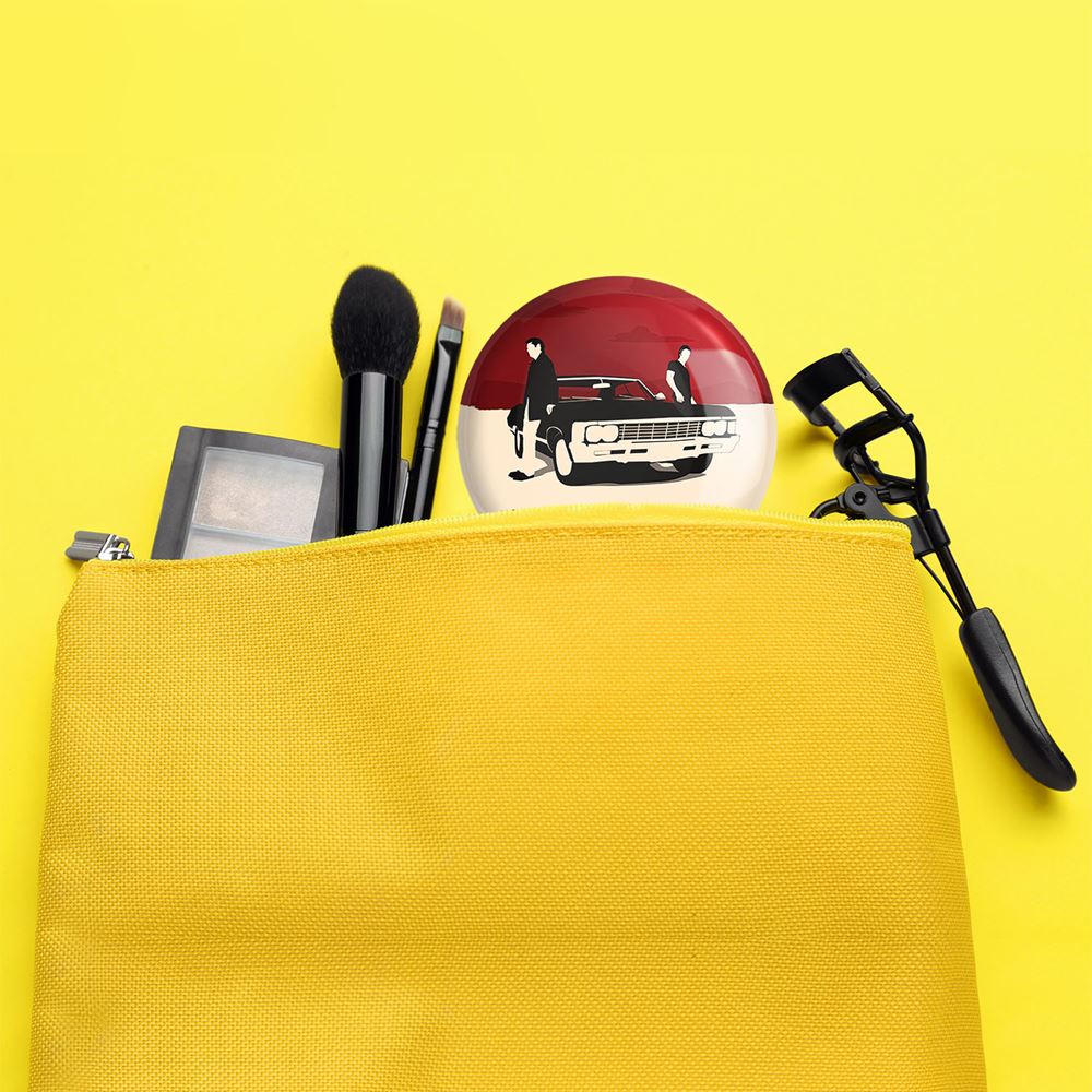 آینه های جیبی سریال سوپرنچرال Supernatural خندالو دایره ای به قطر 7.5 سانتی متر می باشد که نه خیلی بزرگ و غیر قابل استفاده در کیف آرایشی ست و نه خیلی کوچک که تصویر خاصی در آن مشاهده نشود. سایزی استاندارد و کارآمد دارد و مناسب قرار گیری در کیف لوازم آرایش و کیف های کوچک دستی نیز هست.