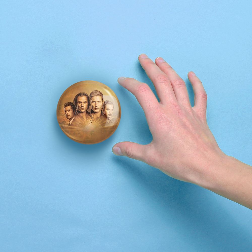 آینه های جیبی سریال سوپرنچرال Supernatural خندالو دایره ای به قطر 7.5 سانتی متر می باشد که نه خیلی بزرگ و غیر قابل استفاده در کیف آرایشی ست و نه خیلی کوچک که تصویر خاصی در آن مشاهده نشود. سایزی استاندارد و کارآمد دارد و مناسب قرار گیری در کیف لوازم آرایش و کیف های کوچک دستی نیز هست.