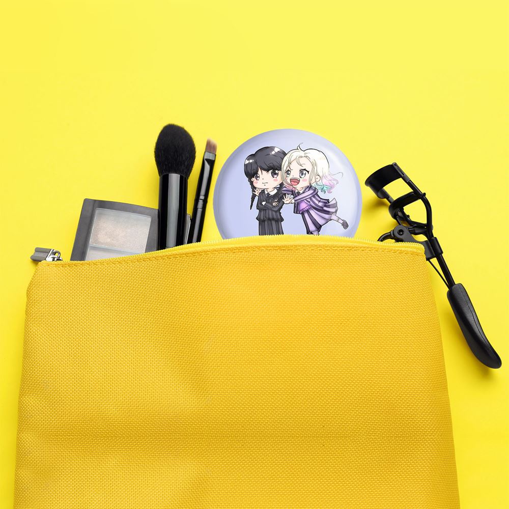 آینه های جیبی سریال ونزدی Wednesday خندالو دایره ای به قطر 7.5 سانتی متر می باشد که نه خیلی بزرگ و غیر قابل استفاده در کیف آرایشی ست و نه خیلی کوچک که تصویر خاصی در آن مشاهده نشود. سایزی استاندارد و کارآمد دارد و مناسب قرار گیری در کیف لوازم آرایش و کیف های کوچک دستی نیز هست.