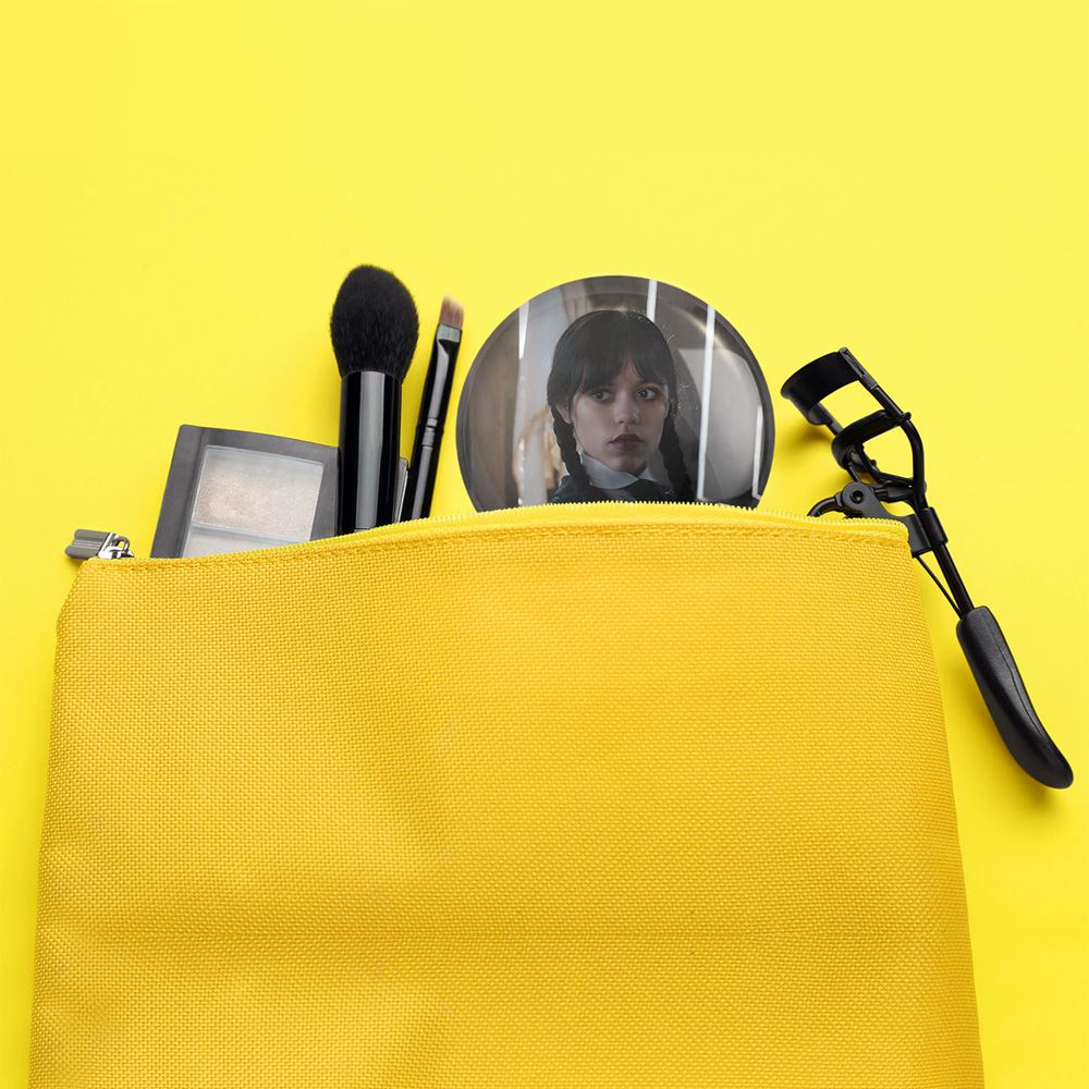 آینه های جیبی سریال ونزدی Wednesday خندالو دایره ای به قطر 7.5 سانتی متر می باشد که نه خیلی بزرگ و غیر قابل استفاده در کیف آرایشی ست و نه خیلی کوچک که تصویر خاصی در آن مشاهده نشود. سایزی استاندارد و کارآمد دارد و مناسب قرار گیری در کیف لوازم آرایش و کیف های کوچک دستی نیز هست.
