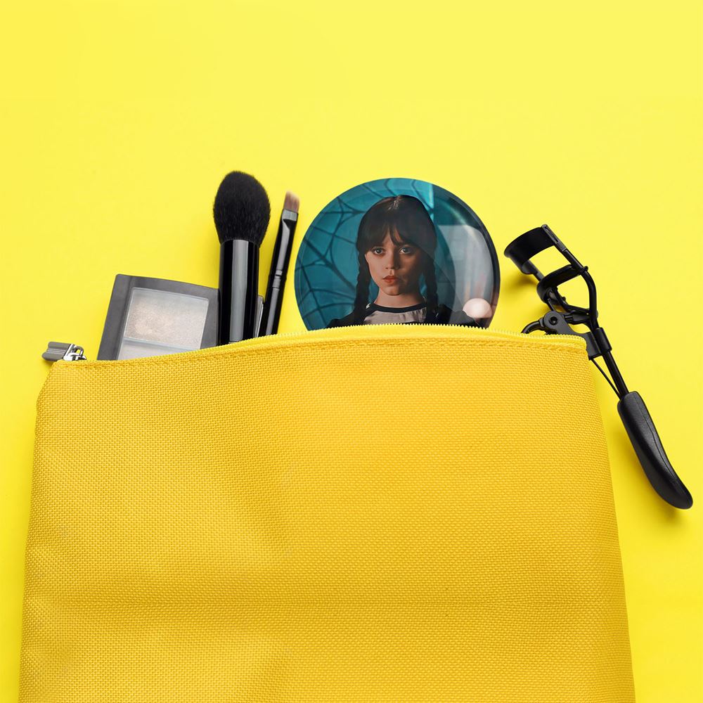 آینه های جیبی سریال ونزدی Wednesday خندالو دایره ای به قطر 7.5 سانتی متر می باشد که نه خیلی بزرگ و غیر قابل استفاده در کیف آرایشی ست و نه خیلی کوچک که تصویر خاصی در آن مشاهده نشود. سایزی استاندارد و کارآمد دارد و مناسب قرار گیری در کیف لوازم آرایش و کیف های کوچک دستی نیز هست.