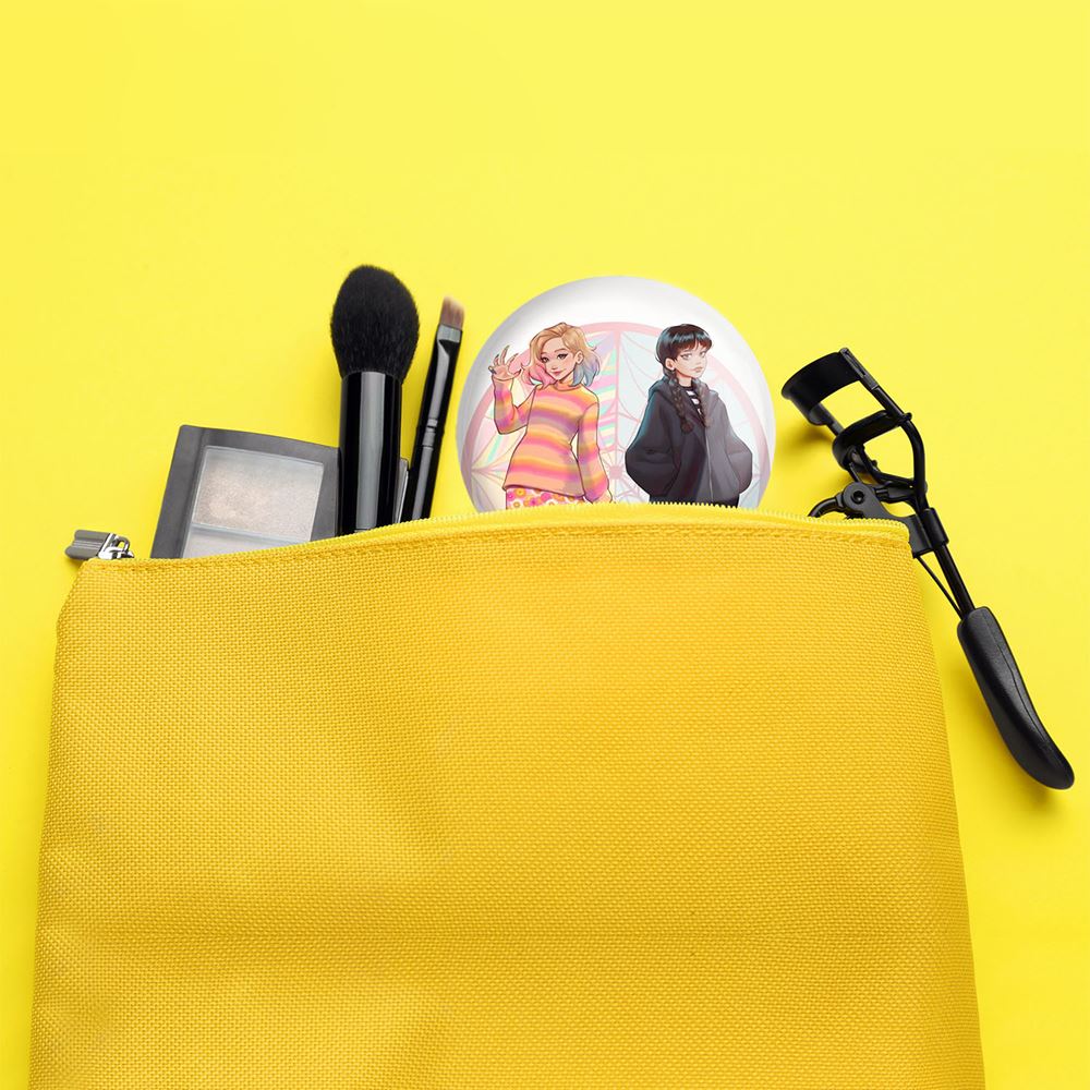 آینه های جیبی سریال ونزدی Wednesday خندالو دایره ای به قطر 7.5 سانتی متر می باشد که نه خیلی بزرگ و غیر قابل استفاده در کیف آرایشی ست و نه خیلی کوچک که تصویر خاصی در آن مشاهده نشود. سایزی استاندارد و کارآمد دارد و مناسب قرار گیری در کیف لوازم آرایش و کیف های کوچک دستی نیز هست.