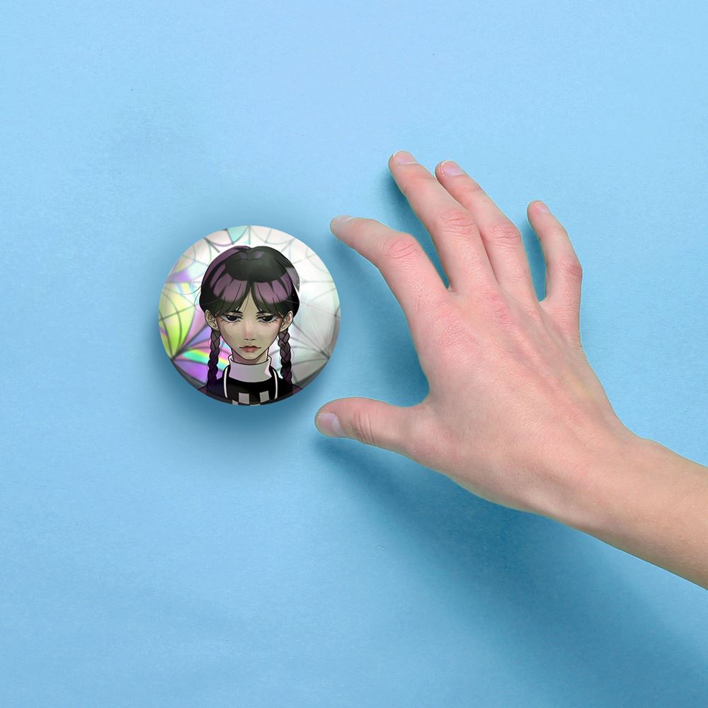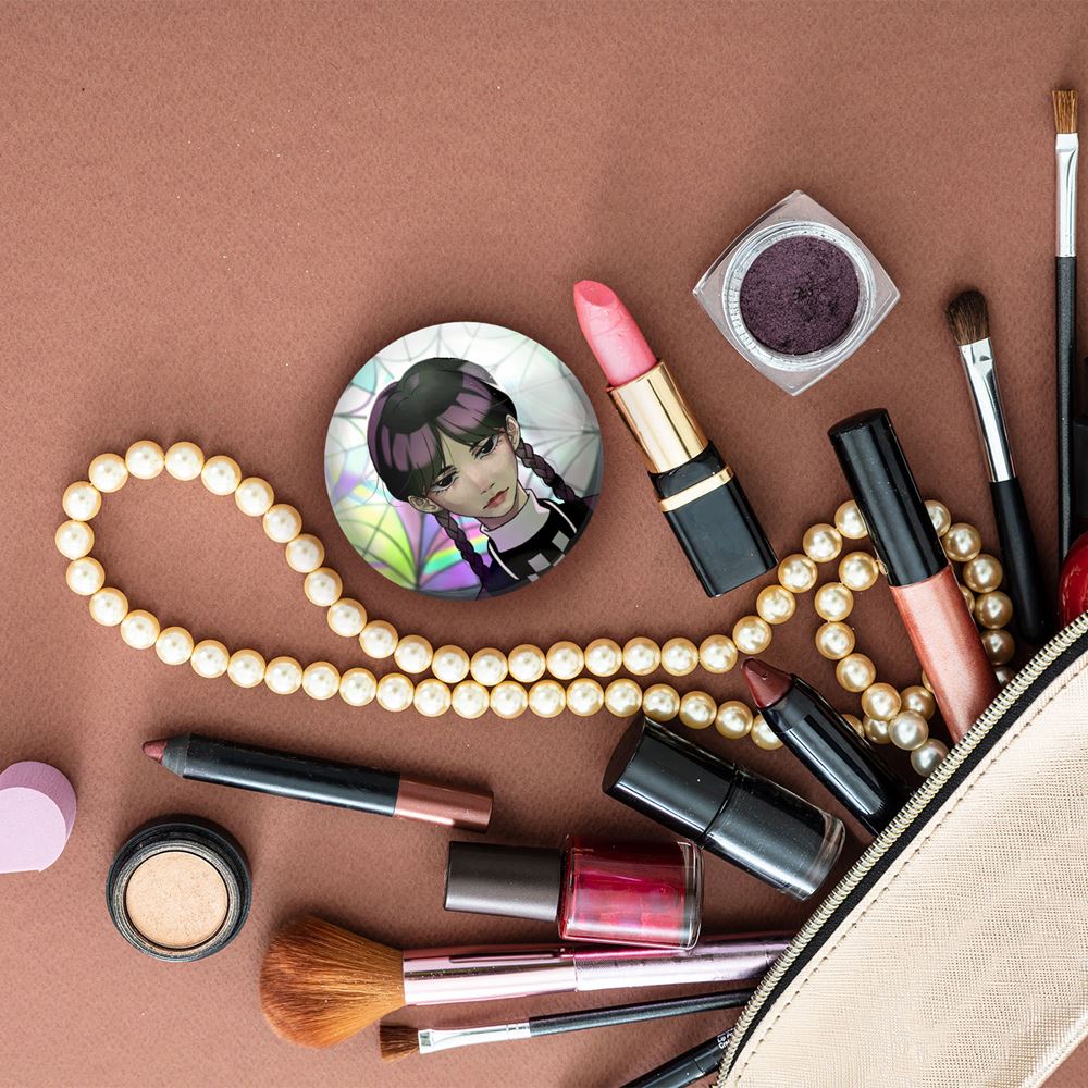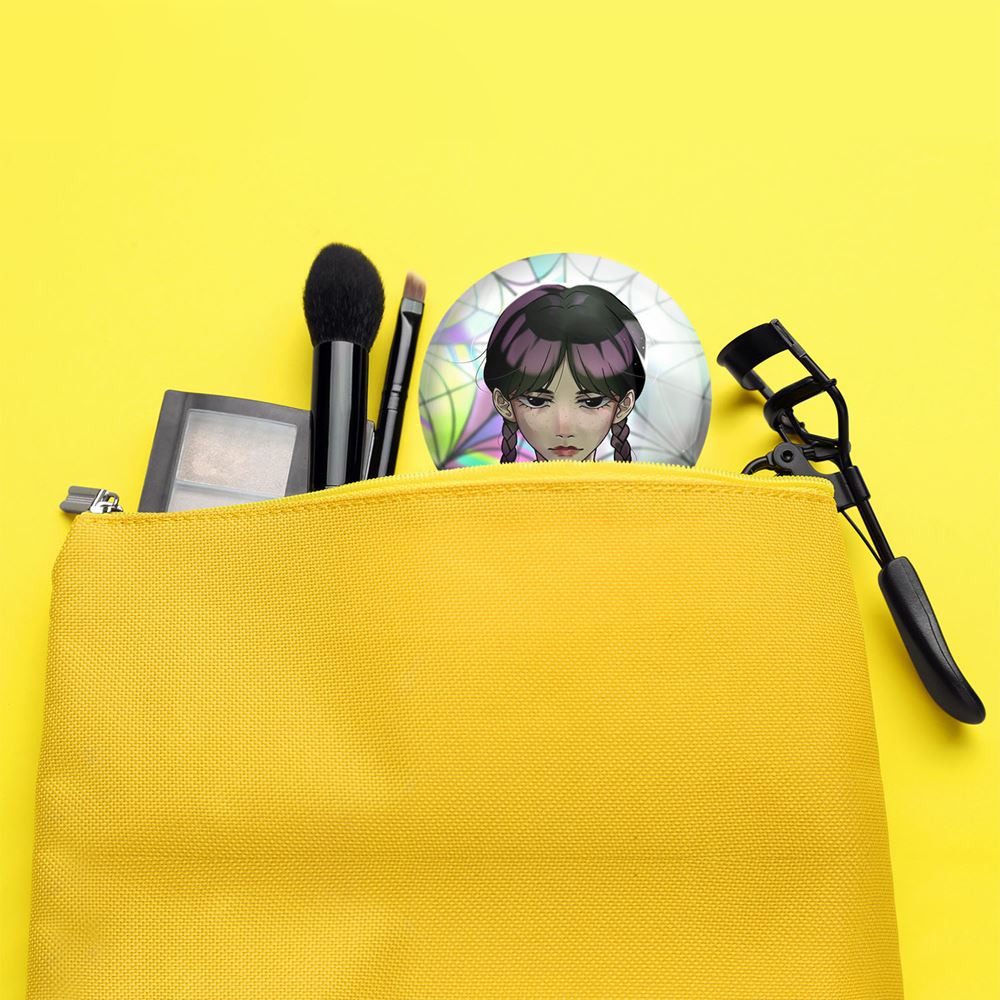 آینه های جیبی سریال ونزدی Wednesday خندالو دایره ای به قطر 7.5 سانتی متر می باشد که نه خیلی بزرگ و غیر قابل استفاده در کیف آرایشی ست و نه خیلی کوچک که تصویر خاصی در آن مشاهده نشود. سایزی استاندارد و کارآمد دارد و مناسب قرار گیری در کیف لوازم آرایش و کیف های کوچک دستی نیز هست.