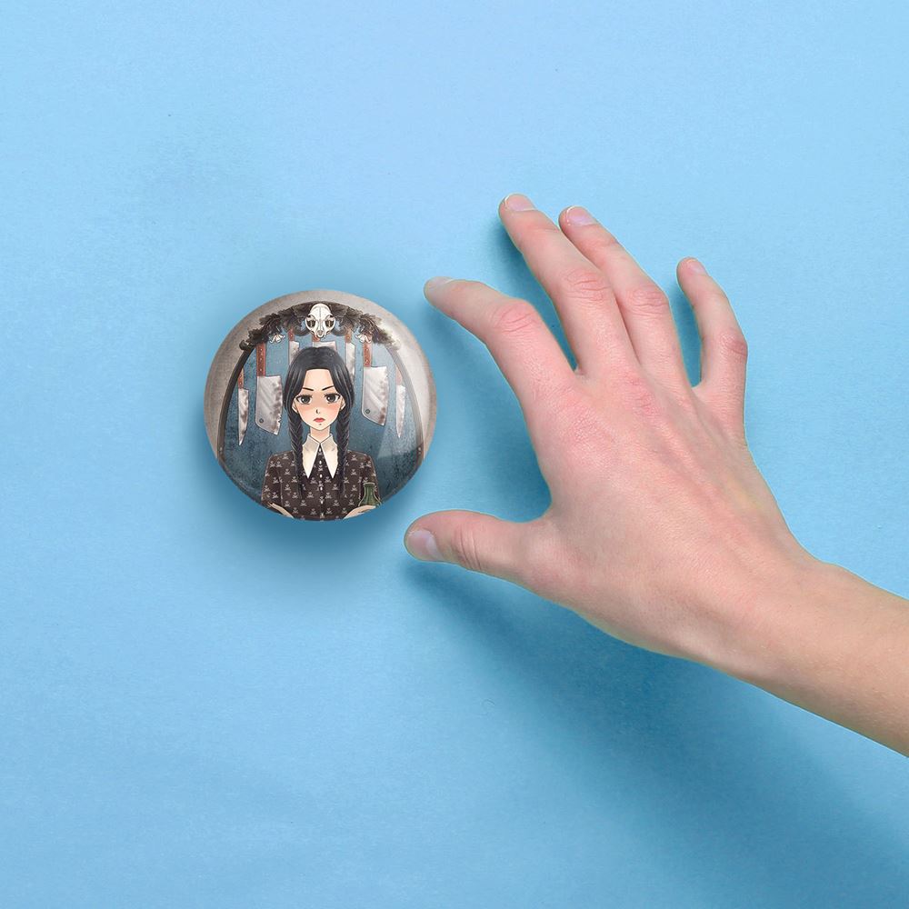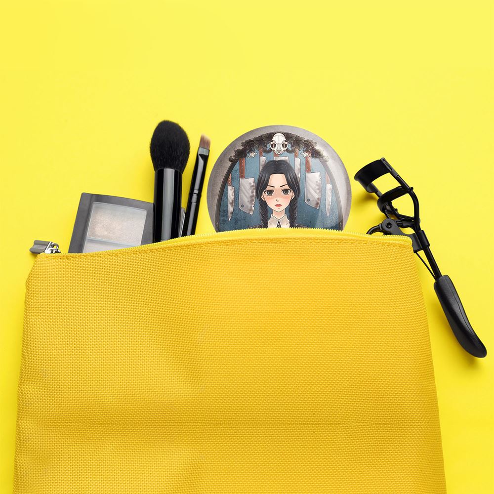 آینه های جیبی سریال ونزدی Wednesday خندالو دایره ای به قطر 7.5 سانتی متر می باشد که نه خیلی بزرگ و غیر قابل استفاده در کیف آرایشی ست و نه خیلی کوچک که تصویر خاصی در آن مشاهده نشود. سایزی استاندارد و کارآمد دارد و مناسب قرار گیری در کیف لوازم آرایش و کیف های کوچک دستی نیز هست.