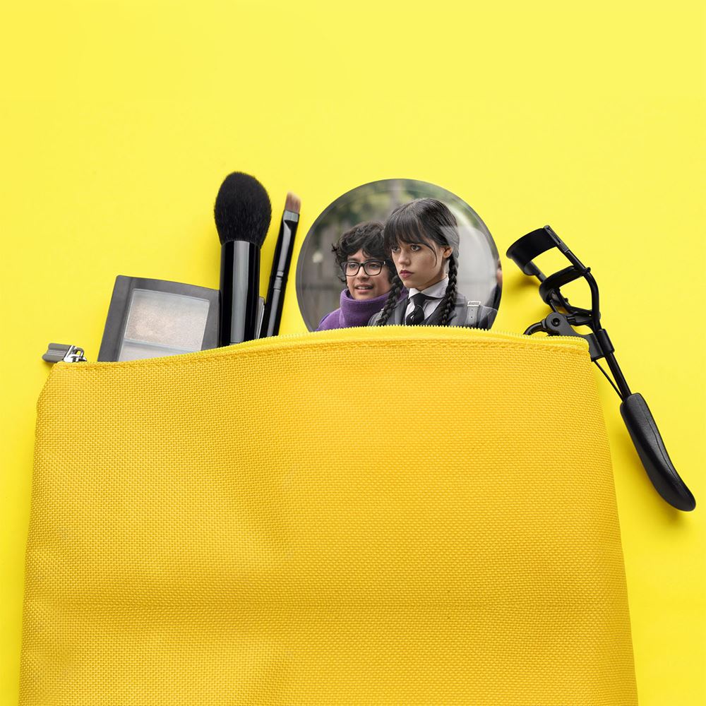آینه های جیبی سریال ونزدی Wednesday خندالو دایره ای به قطر 7.5 سانتی متر می باشد که نه خیلی بزرگ و غیر قابل استفاده در کیف آرایشی ست و نه خیلی کوچک که تصویر خاصی در آن مشاهده نشود. سایزی استاندارد و کارآمد دارد و مناسب قرار گیری در کیف لوازم آرایش و کیف های کوچک دستی نیز هست.