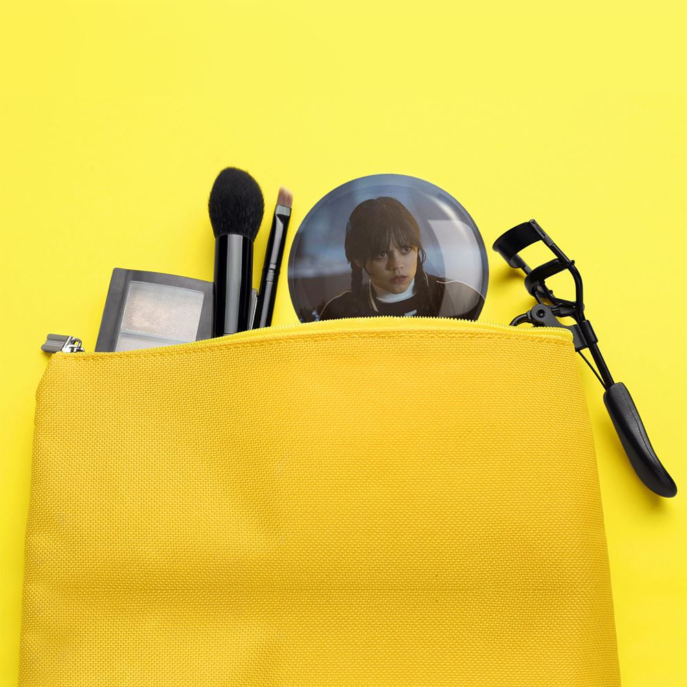 آینه های جیبی سریال ونزدی Wednesday خندالو دایره ای به قطر 7.5 سانتی متر می باشد که نه خیلی بزرگ و غیر قابل استفاده در کیف آرایشی ست و نه خیلی کوچک که تصویر خاصی در آن مشاهده نشود. سایزی استاندارد و کارآمد دارد و مناسب قرار گیری در کیف لوازم آرایش و کیف های کوچک دستی نیز هست.