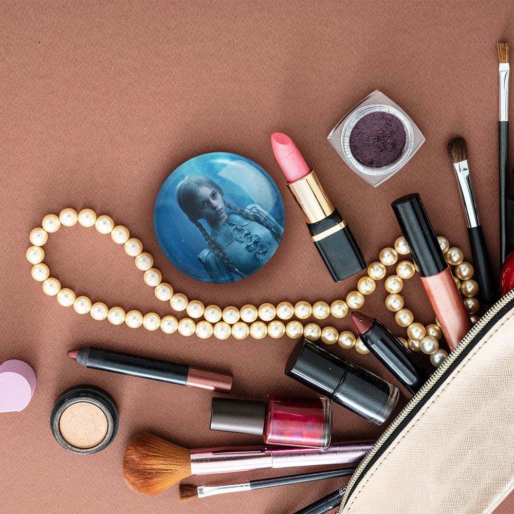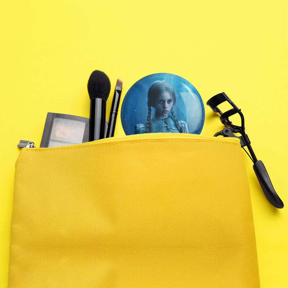 آینه های جیبی سریال ونزدی Wednesday خندالو دایره ای به قطر 7.5 سانتی متر می باشد که نه خیلی بزرگ و غیر قابل استفاده در کیف آرایشی ست و نه خیلی کوچک که تصویر خاصی در آن مشاهده نشود. سایزی استاندارد و کارآمد دارد و مناسب قرار گیری در کیف لوازم آرایش و کیف های کوچک دستی نیز هست.