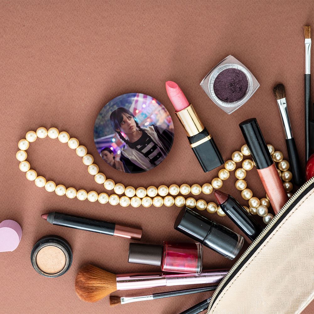 آینه های جیبی سریال ونزدی Wednesday خندالو دایره ای به قطر 7.5 سانتی متر می باشد که نه خیلی بزرگ و غیر قابل استفاده در کیف آرایشی ست و نه خیلی کوچک که تصویر خاصی در آن مشاهده نشود. سایزی استاندارد و کارآمد دارد و مناسب قرار گیری در کیف لوازم آرایش و کیف های کوچک دستی نیز هست.