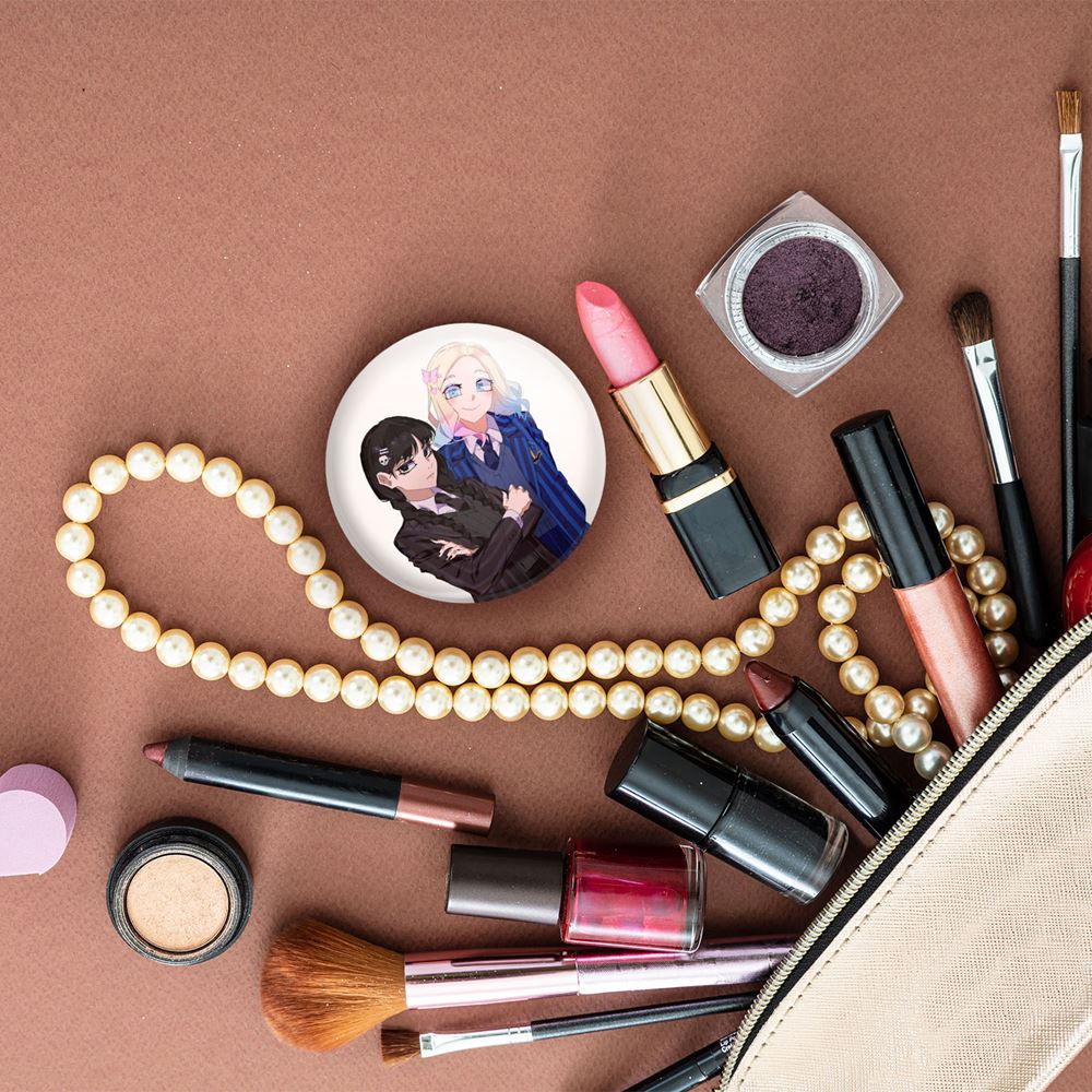 آینه های جیبی سریال ونزدی Wednesday خندالو دایره ای به قطر 7.5 سانتی متر می باشد که نه خیلی بزرگ و غیر قابل استفاده در کیف آرایشی ست و نه خیلی کوچک که تصویر خاصی در آن مشاهده نشود. سایزی استاندارد و کارآمد دارد و مناسب قرار گیری در کیف لوازم آرایش و کیف های کوچک دستی نیز هست.