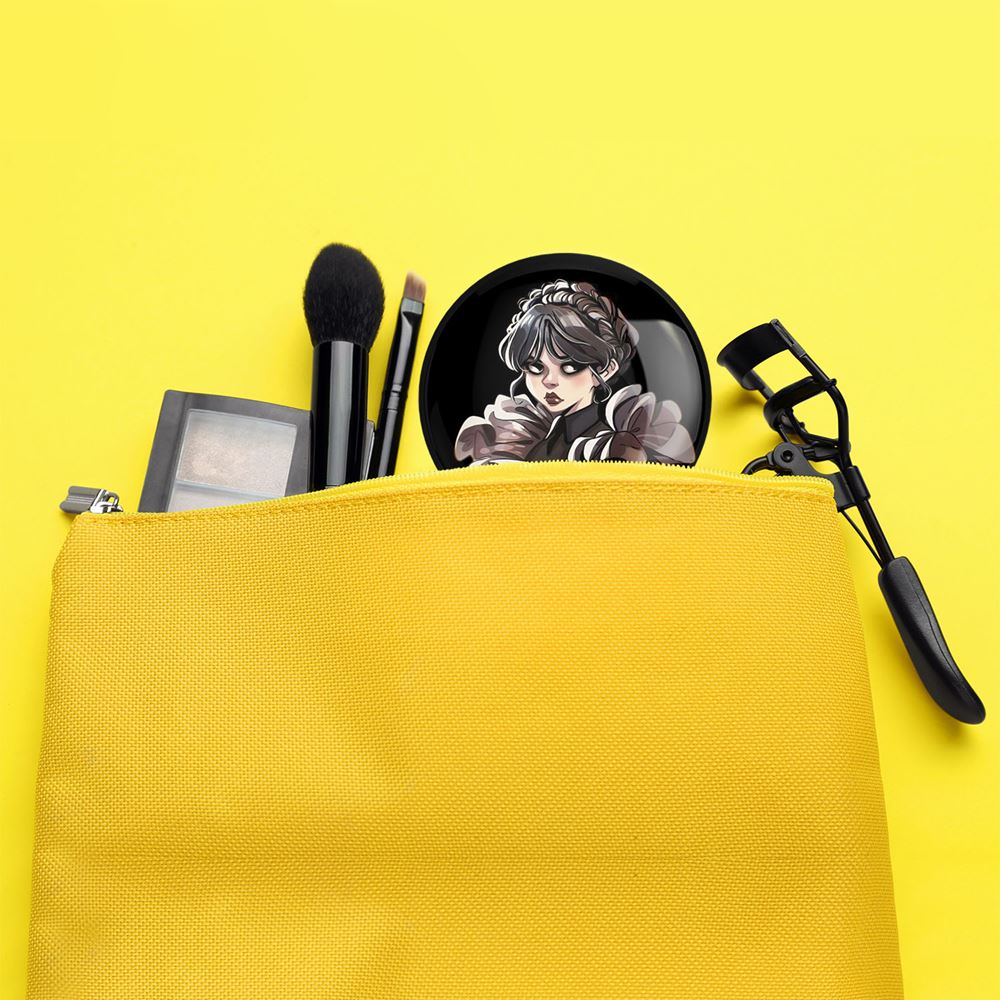 آینه های جیبی سریال ونزدی Wednesday خندالو دایره ای به قطر 7.5 سانتی متر می باشد که نه خیلی بزرگ و غیر قابل استفاده در کیف آرایشی ست و نه خیلی کوچک که تصویر خاصی در آن مشاهده نشود. سایزی استاندارد و کارآمد دارد و مناسب قرار گیری در کیف لوازم آرایش و کیف های کوچک دستی نیز هست.