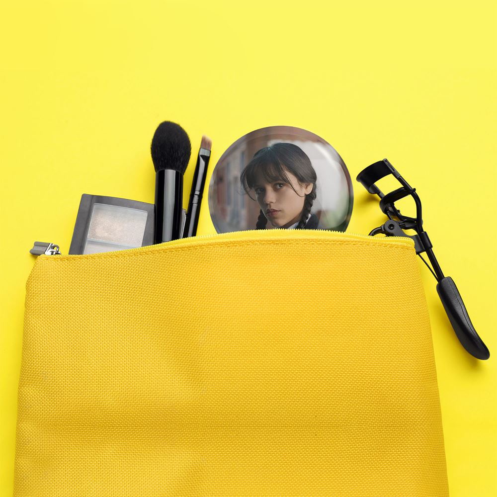 آینه های جیبی سریال ونزدی Wednesday خندالو دایره ای به قطر 7.5 سانتی متر می باشد که نه خیلی بزرگ و غیر قابل استفاده در کیف آرایشی ست و نه خیلی کوچک که تصویر خاصی در آن مشاهده نشود. سایزی استاندارد و کارآمد دارد و مناسب قرار گیری در کیف لوازم آرایش و کیف های کوچک دستی نیز هست.