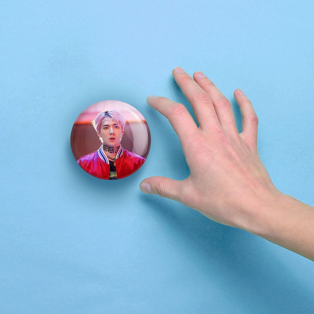 آینه های جیبی سهون گروه اکسو EXO خندالو دایره ای به قطر 7.5 سانتی متر می باشد که نه خیلی بزرگ و غیر قابل استفاده در کیف آرایشی ست و نه خیلی کوچک که تصویر خاصی در آن مشاهده نشود. سایزی استاندارد و کارآمد دارد و مناسب قرار گیری در کیف لوازم آرایش و کیف های کوچک دستی نیز هست.