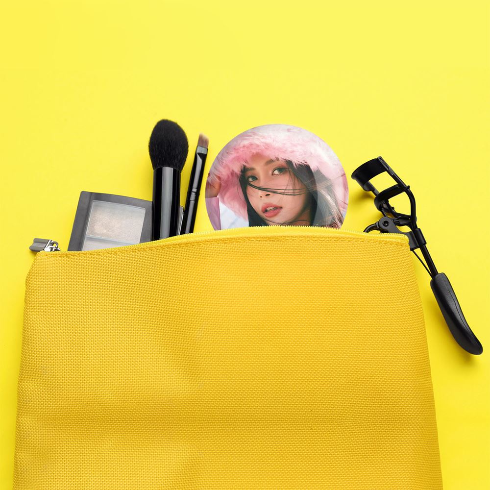 آینه های جیبی سولار گروه مامامو Mamamoo خندالو دایره ای به قطر 7.5 سانتی متر می باشد که نه خیلی بزرگ و غیر قابل استفاده در کیف آرایشی ست و نه خیلی کوچک که تصویر خاصی در آن مشاهده نشود. سایزی استاندارد و کارآمد دارد و مناسب قرار گیری در کیف لوازم آرایش و کیف های کوچک دستی نیز هست.