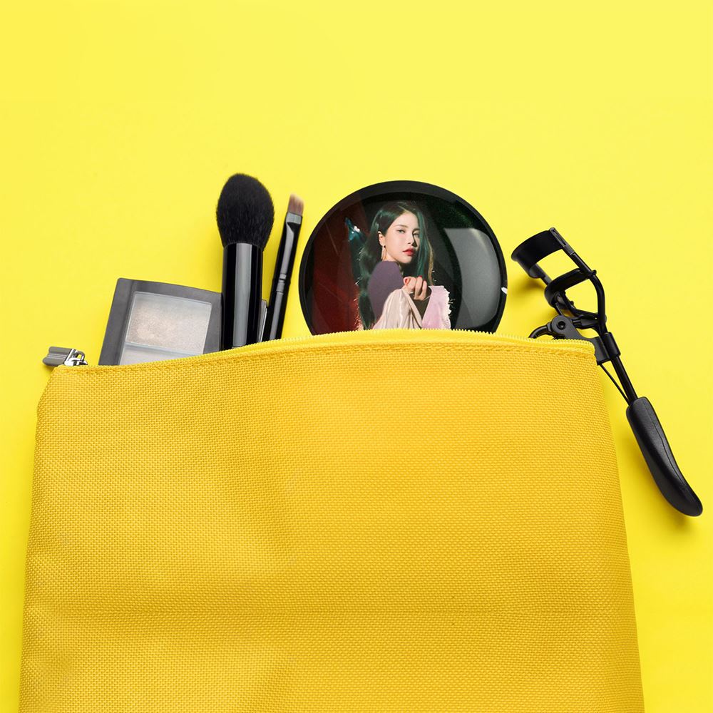 آینه های جیبی سولار گروه مامامو Mamamoo خندالو دایره ای به قطر 7.5 سانتی متر می باشد که نه خیلی بزرگ و غیر قابل استفاده در کیف آرایشی ست و نه خیلی کوچک که تصویر خاصی در آن مشاهده نشود. سایزی استاندارد و کارآمد دارد و مناسب قرار گیری در کیف لوازم آرایش و کیف های کوچک دستی نیز هست.