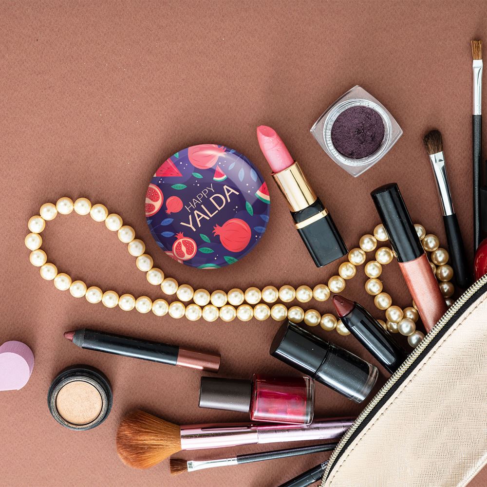 آینه های جیبی شب یلدا خندالو دایره ای به قطر 7.5 سانتی متر می باشد که نه خیلی بزرگ و غیر قابل استفاده در کیف آرایشی ست و نه خیلی کوچک که تصویر خاصی در آن مشاهده نشود. سایزی استاندارد و کارآمد دارد و مناسب قرار گیری در کیف لوازم آرایش و کیف های کوچک دستی نیز هست.