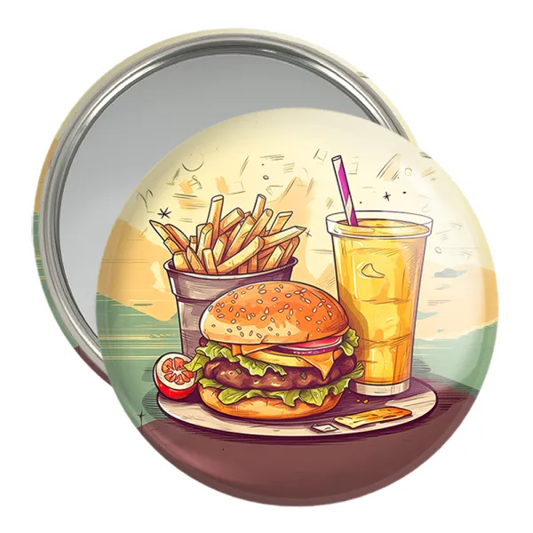 آینه های جیبی فست فود (Fast Food) خندالو دایره ای به قطر 7.5 سانتی متر می باشد که نه خیلی بزرگ و غیر قابل استفاده در کیف آرایشی ست و نه خیلی کوچک که تصویر خاصی در آن مشاهده نشود. سایزی استاندارد و کارآمد دارد و مناسب قرار گیری در کیف لوازم آرایش و کیف های کوچک دستی نیز هست.