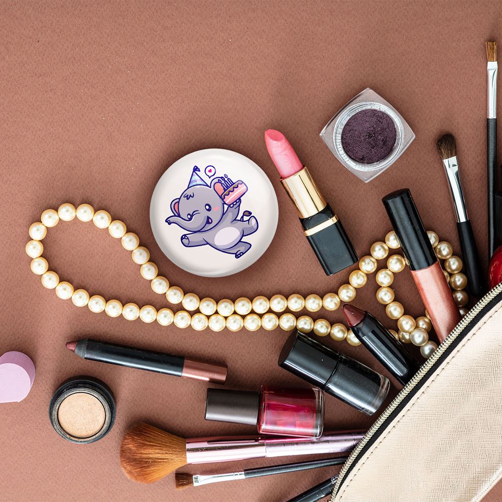 آینه های جیبی فیل کوچولو خندالو دایره ای به قطر 7.5 سانتی متر می باشد که نه خیلی بزرگ و غیر قابل استفاده در کیف آرایشی ست و نه خیلی کوچک که تصویر خاصی در آن مشاهده نشود. سایزی استاندارد و کارآمد دارد و مناسب قرار گیری در کیف لوازم آرایش و کیف های کوچک دستی نیز هست.