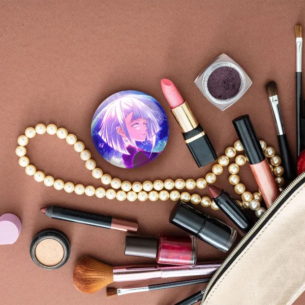 آینه های جیبی لوسی انیمه سایبر پانک Cyberpunk خندالو دایره ای به قطر 7.5 سانتی متر می باشد که نه خیلی بزرگ و غیر قابل استفاده در کیف آرایشی ست و نه خیلی کوچک که تصویر خاصی در آن مشاهده نشود. سایزی استاندارد و کارآمد دارد و مناسب قرار گیری در کیف لوازم آرایش و کیف های کوچک دستی نیز هست.