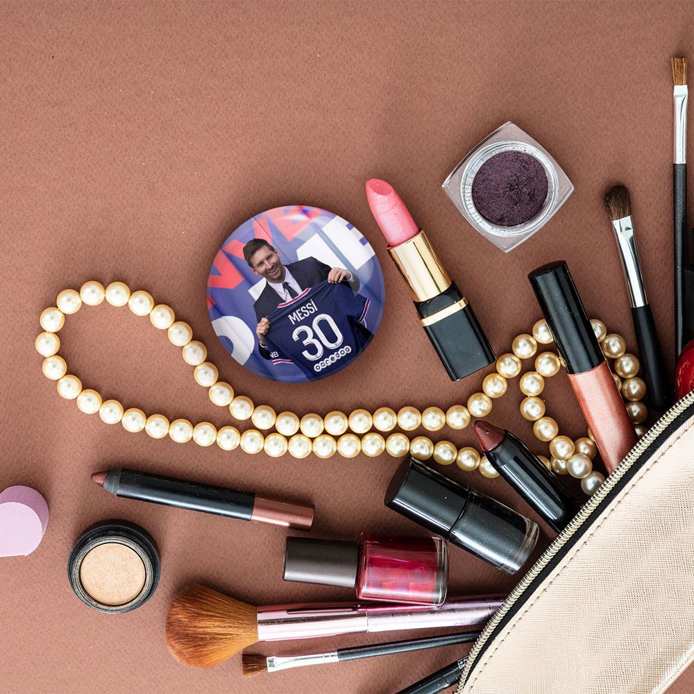 آینه های جیبی لیونل مسی خندالو دایره ای به قطر 7.5 سانتی متر می باشد که نه خیلی بزرگ و غیر قابل استفاده در کیف آرایشی ست و نه خیلی کوچک که تصویر خاصی در آن مشاهده نشود. سایزی استاندارد و کارآمد دارد و مناسب قرار گیری در کیف لوازم آرایش و کیف های کوچک دستی نیز هست.