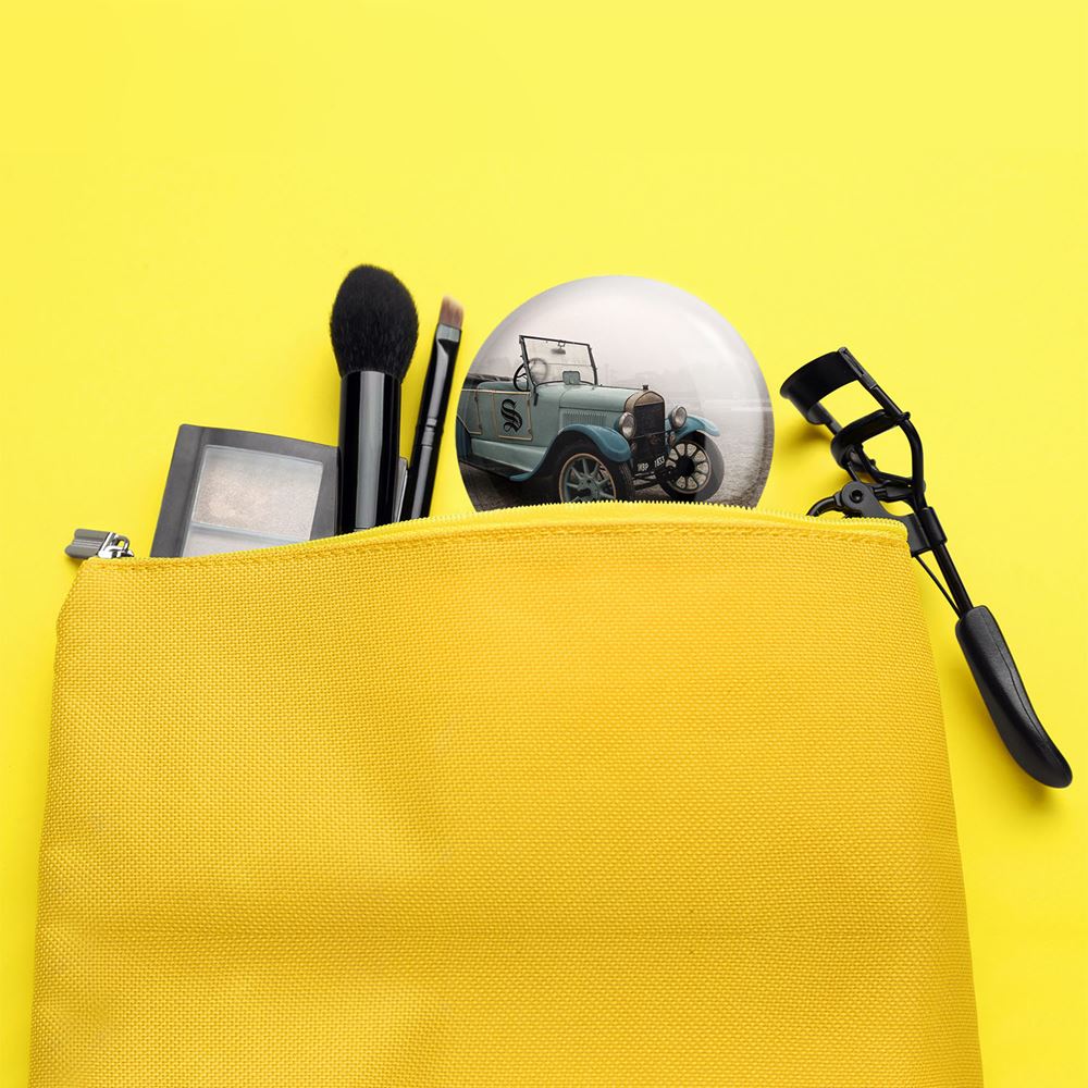 آینه های جیبی ماشین کلاسیک خندالو دایره ای به قطر 7.5 سانتی متر می باشد که نه خیلی بزرگ و غیر قابل استفاده در کیف آرایشی ست و نه خیلی کوچک که تصویر خاصی در آن مشاهده نشود. سایزی استاندارد و کارآمد دارد و مناسب قرار گیری در کیف لوازم آرایش و کیف های کوچک دستی نیز هست.