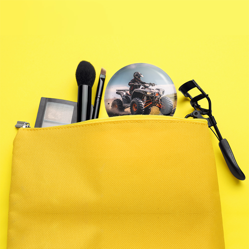 آینه های جیبی موتور چهار چرخ خندالو دایره ای به قطر 7.5 سانتی متر می باشد که نه خیلی بزرگ و غیر قابل استفاده در کیف آرایشی ست و نه خیلی کوچک که تصویر خاصی در آن مشاهده نشود. سایزی استاندارد و کارآمد دارد و مناسب قرار گیری در کیف لوازم آرایش و کیف های کوچک دستی نیز هست.