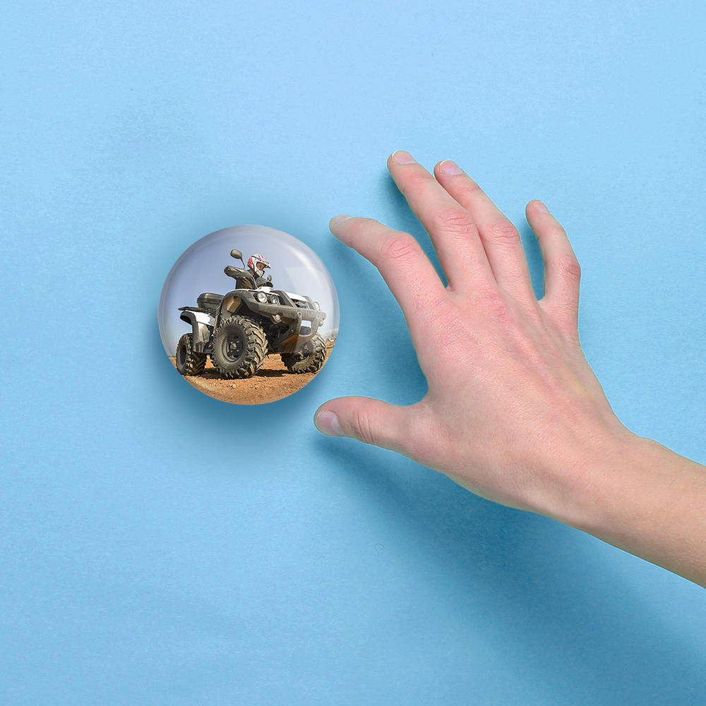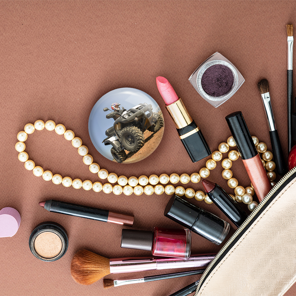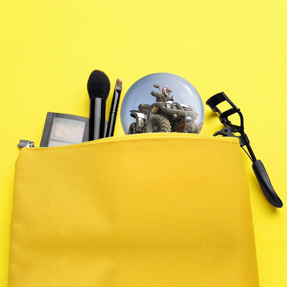 آینه های جیبی موتور چهار چرخ خندالو دایره ای به قطر 7.5 سانتی متر می باشد که نه خیلی بزرگ و غیر قابل استفاده در کیف آرایشی ست و نه خیلی کوچک که تصویر خاصی در آن مشاهده نشود. سایزی استاندارد و کارآمد دارد و مناسب قرار گیری در کیف لوازم آرایش و کیف های کوچک دستی نیز هست.