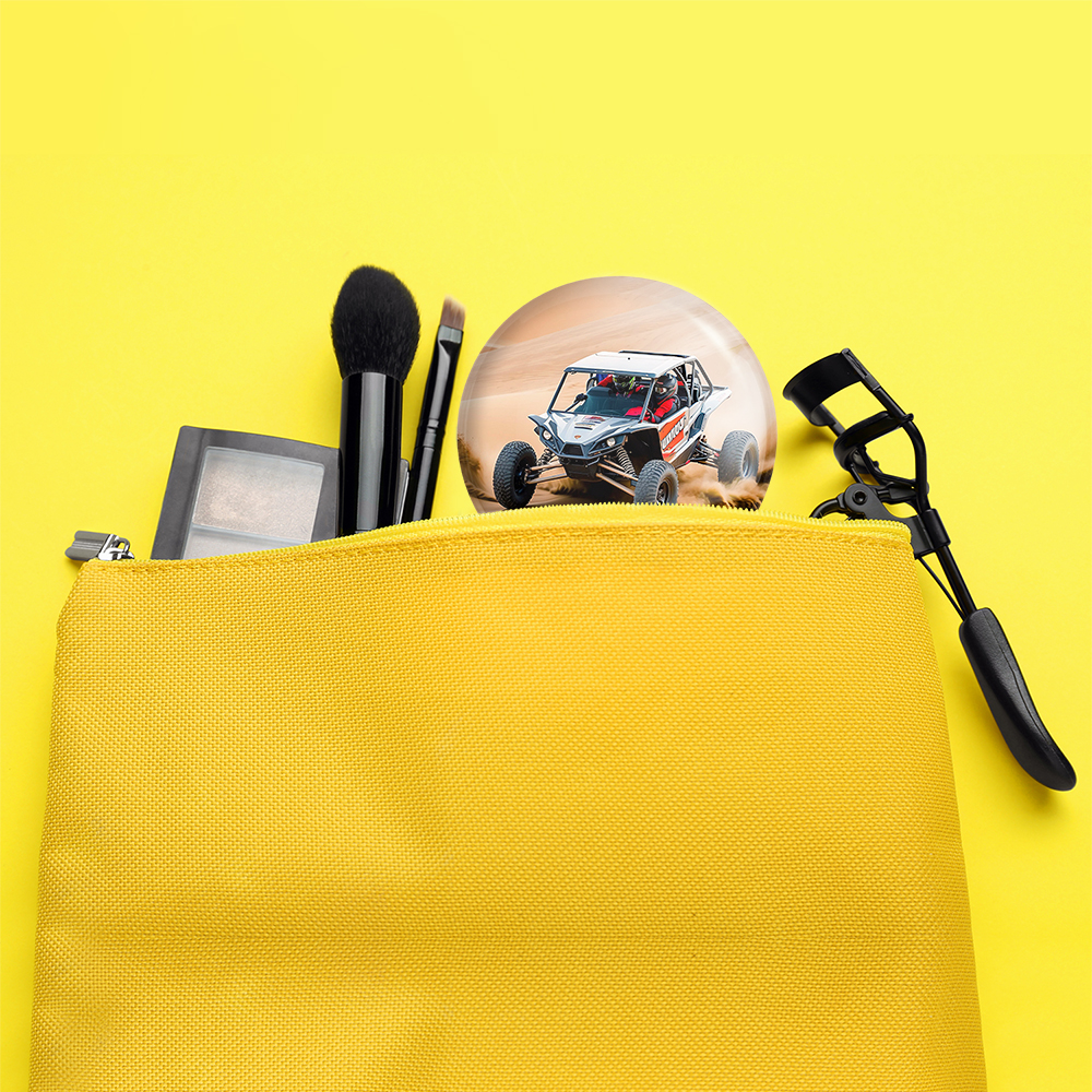 آینه های جیبی موتور چهار چرخ خندالو دایره ای به قطر 7.5 سانتی متر می باشد که نه خیلی بزرگ و غیر قابل استفاده در کیف آرایشی ست و نه خیلی کوچک که تصویر خاصی در آن مشاهده نشود. سایزی استاندارد و کارآمد دارد و مناسب قرار گیری در کیف لوازم آرایش و کیف های کوچک دستی نیز هست.