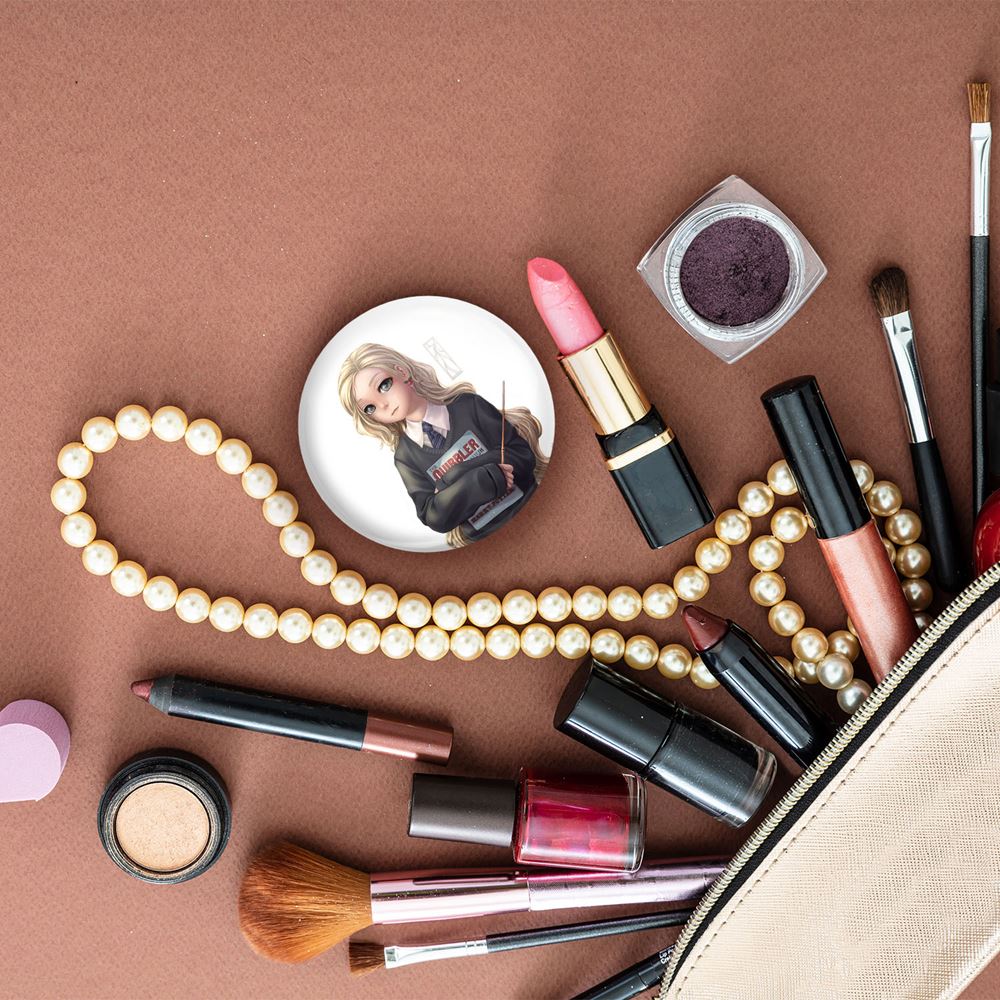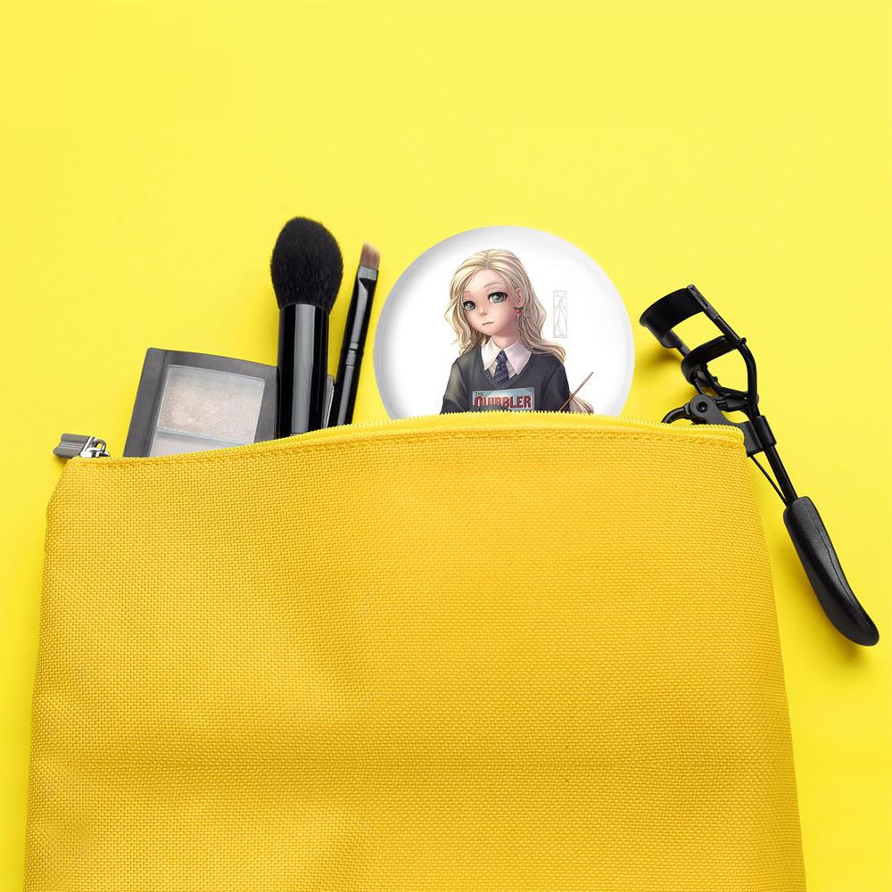 آینه های جیبی هری پاتر لونا لاوگود خندالو دایره ای به قطر 7.5 سانتی متر می باشد که نه خیلی بزرگ و غیر قابل استفاده در کیف آرایشی ست و نه خیلی کوچک که تصویر خاصی در آن مشاهده نشود. سایزی استاندارد و کارآمد دارد و مناسب قرار گیری در کیف لوازم آرایش و کیف های کوچک دستی نیز هست.