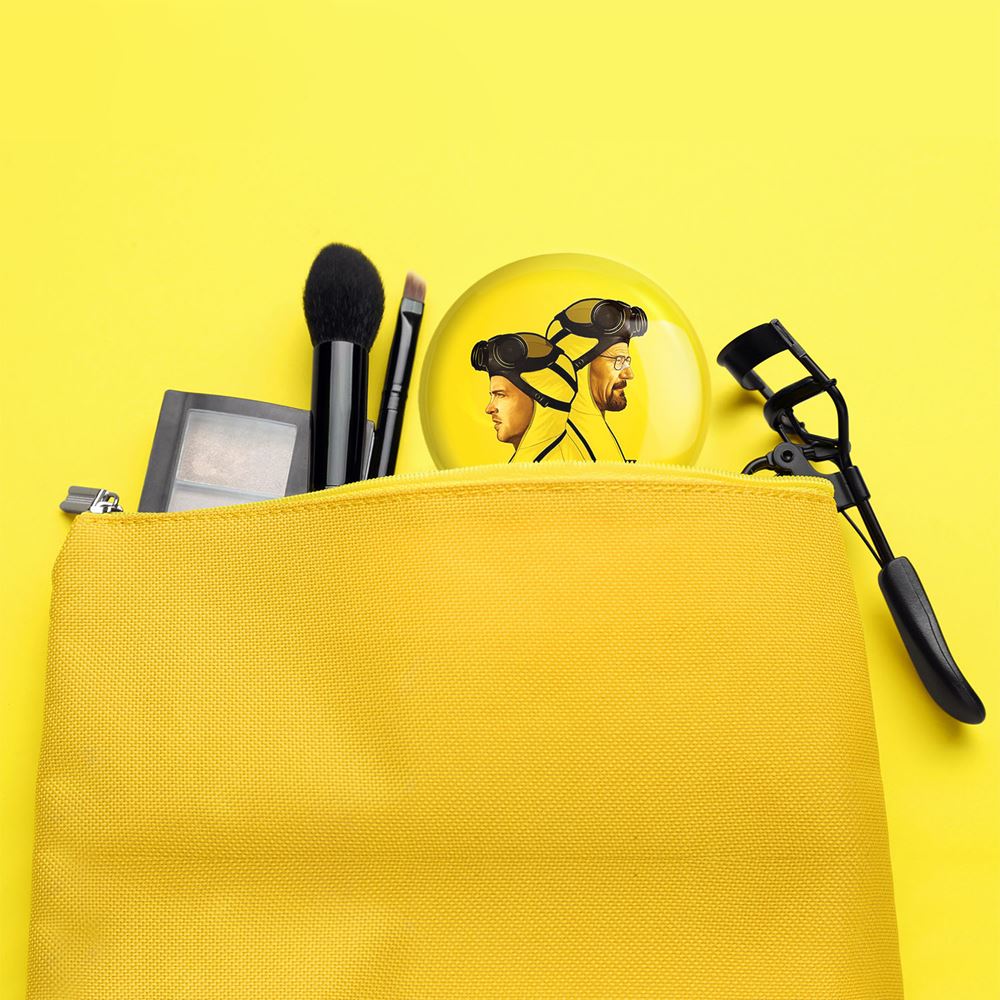 آینه های جیبی والتر وایت و جسی پینکمن سریال بریکینگ بد Breaking Bad خندالو دایره ای به قطر 7.5 سانتی متر می باشد که نه خیلی بزرگ و غیر قابل استفاده در کیف آرایشی ست و نه خیلی کوچک که تصویر خاصی در آن مشاهده نشود. سایزی استاندارد و کارآمد دارد و مناسب قرار گیری در کیف لوازم آرایش و کیف های کوچک دستی نیز هست.