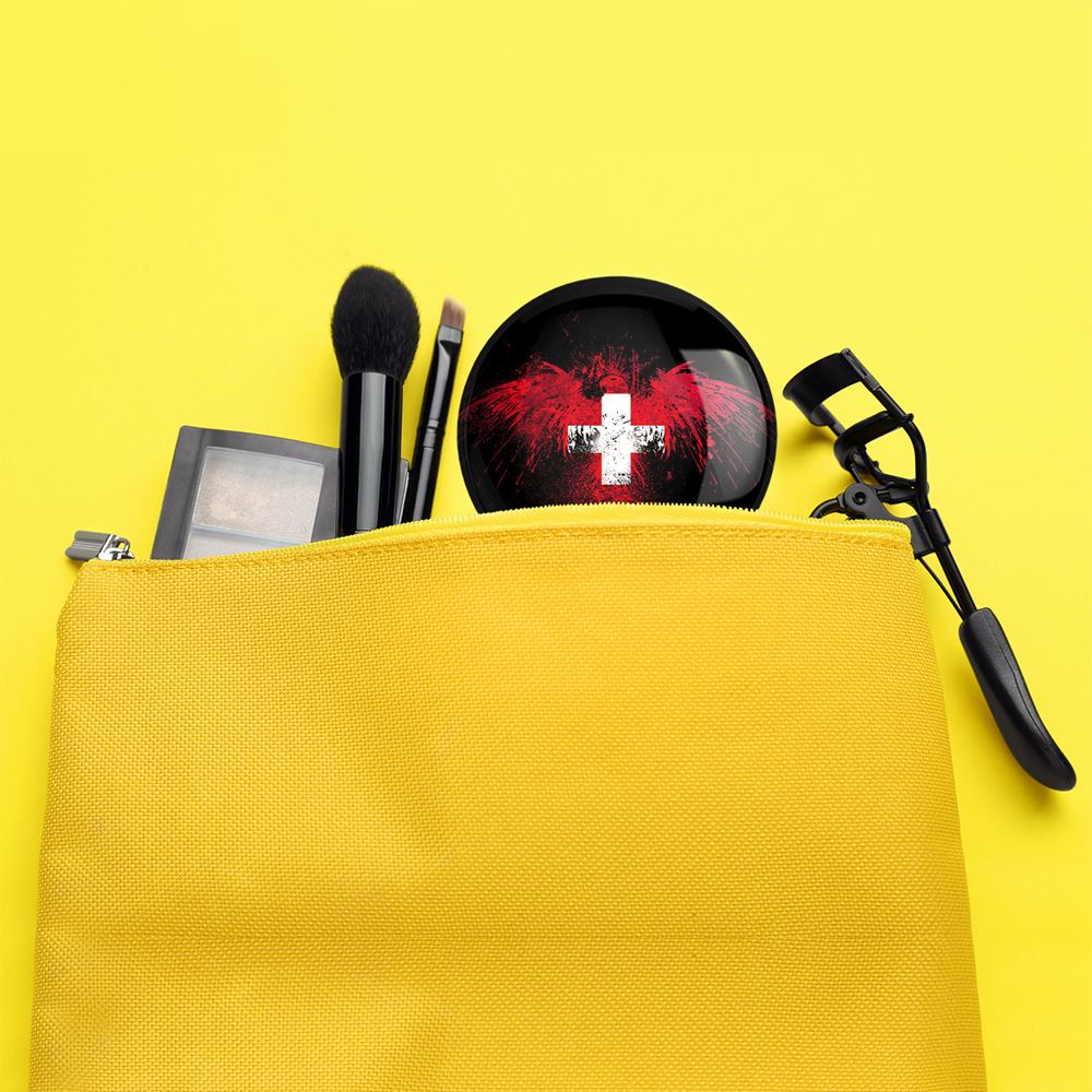 آینه های جیبی پرچم سوئیس خندالو دایره ای به قطر 7.5 سانتی متر می باشد که نه خیلی بزرگ و غیر قابل استفاده در کیف آرایشی ست و نه خیلی کوچک که تصویر خاصی در آن مشاهده نشود. سایزی استاندارد و کارآمد دارد و مناسب قرار گیری در کیف لوازم آرایش و کیف های کوچک دستی نیز هست.