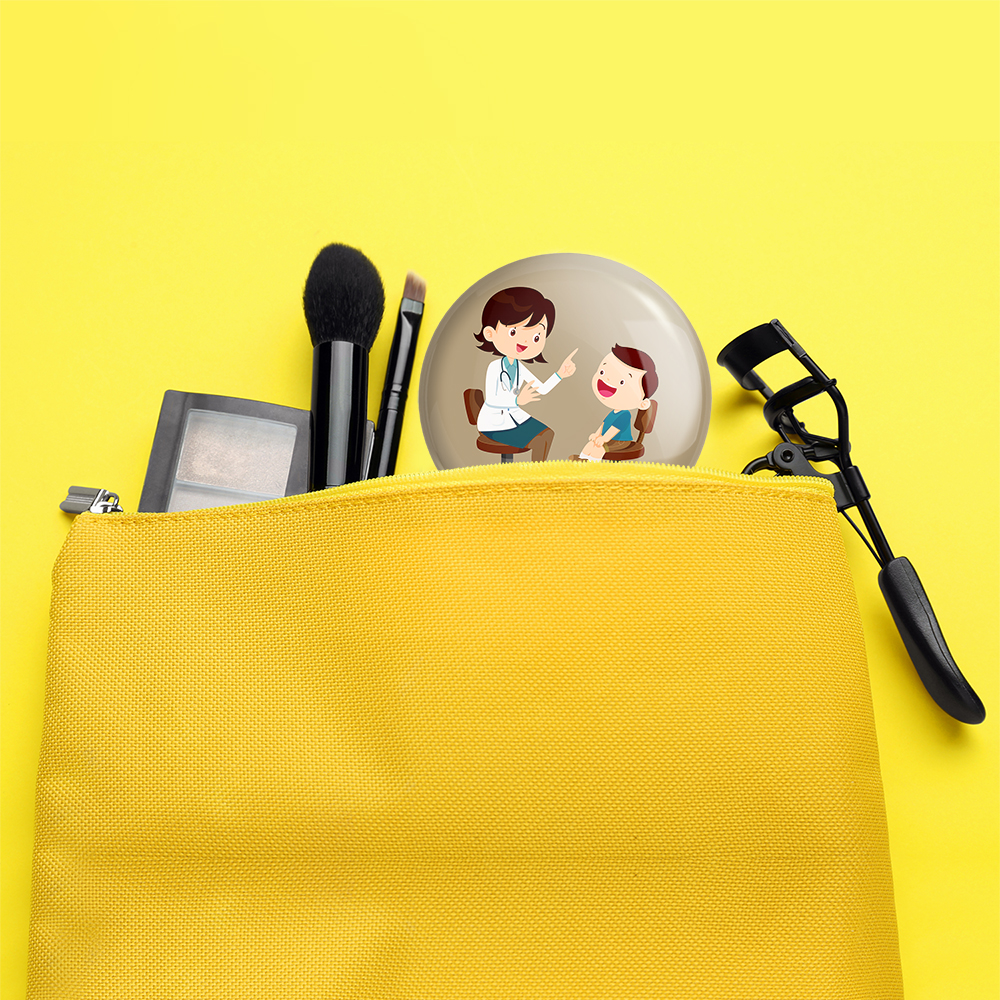آینه های جیبی پزشک و پرستار کودکانه خندالو دایره ای به قطر 7.5 سانتی متر می باشد که نه خیلی بزرگ و غیر قابل استفاده در کیف آرایشی ست و نه خیلی کوچک که تصویر خاصی در آن مشاهده نشود. سایزی استاندارد و کارآمد دارد و مناسب قرار گیری در کیف لوازم آرایش و کیف های کوچک دستی نیز هست.