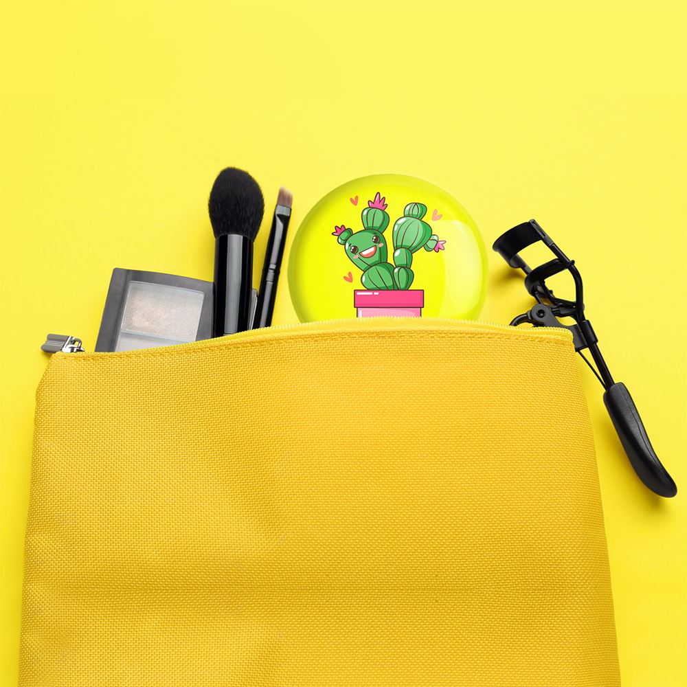 آینه های جیبی کاکتوس خندالو دایره ای به قطر 7.5 سانتی متر می باشد که نه خیلی بزرگ و غیر قابل استفاده در کیف آرایشی ست و نه خیلی کوچک که تصویر خاصی در آن مشاهده نشود. سایزی استاندارد و کارآمد دارد و مناسب قرار گیری در کیف لوازم آرایش و کیف های کوچک دستی نیز هست.