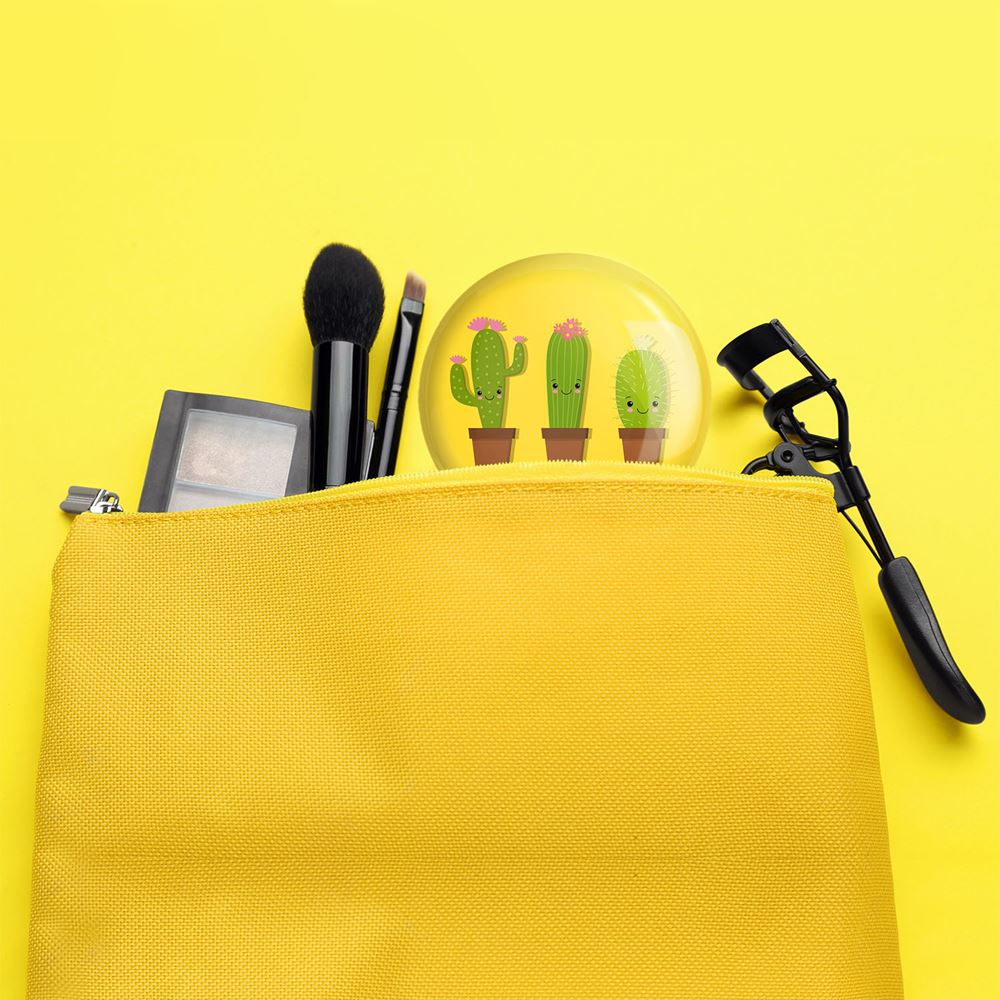 آینه های جیبی کاکتوس خندالو دایره ای به قطر 7.5 سانتی متر می باشد که نه خیلی بزرگ و غیر قابل استفاده در کیف آرایشی ست و نه خیلی کوچک که تصویر خاصی در آن مشاهده نشود. سایزی استاندارد و کارآمد دارد و مناسب قرار گیری در کیف لوازم آرایش و کیف های کوچک دستی نیز هست.