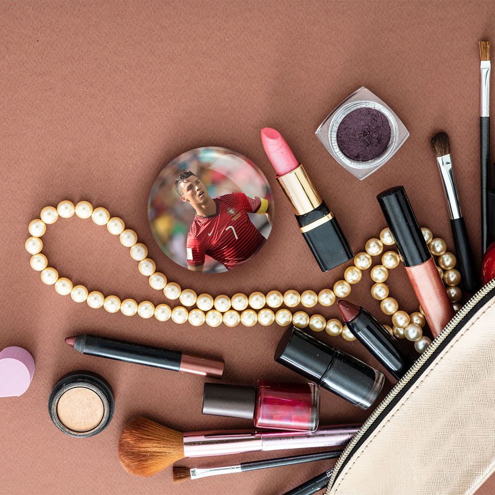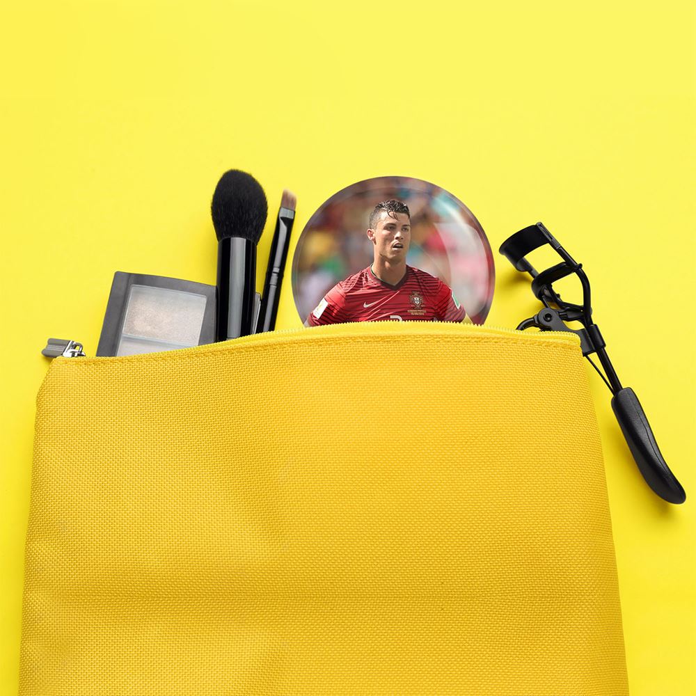 آینه های جیبی کریستیانو رونالدو خندالو دایره ای به قطر 7.5 سانتی متر می باشد که نه خیلی بزرگ و غیر قابل استفاده در کیف آرایشی ست و نه خیلی کوچک که تصویر خاصی در آن مشاهده نشود. سایزی استاندارد و کارآمد دارد و مناسب قرار گیری در کیف لوازم آرایش و کیف های کوچک دستی نیز هست.