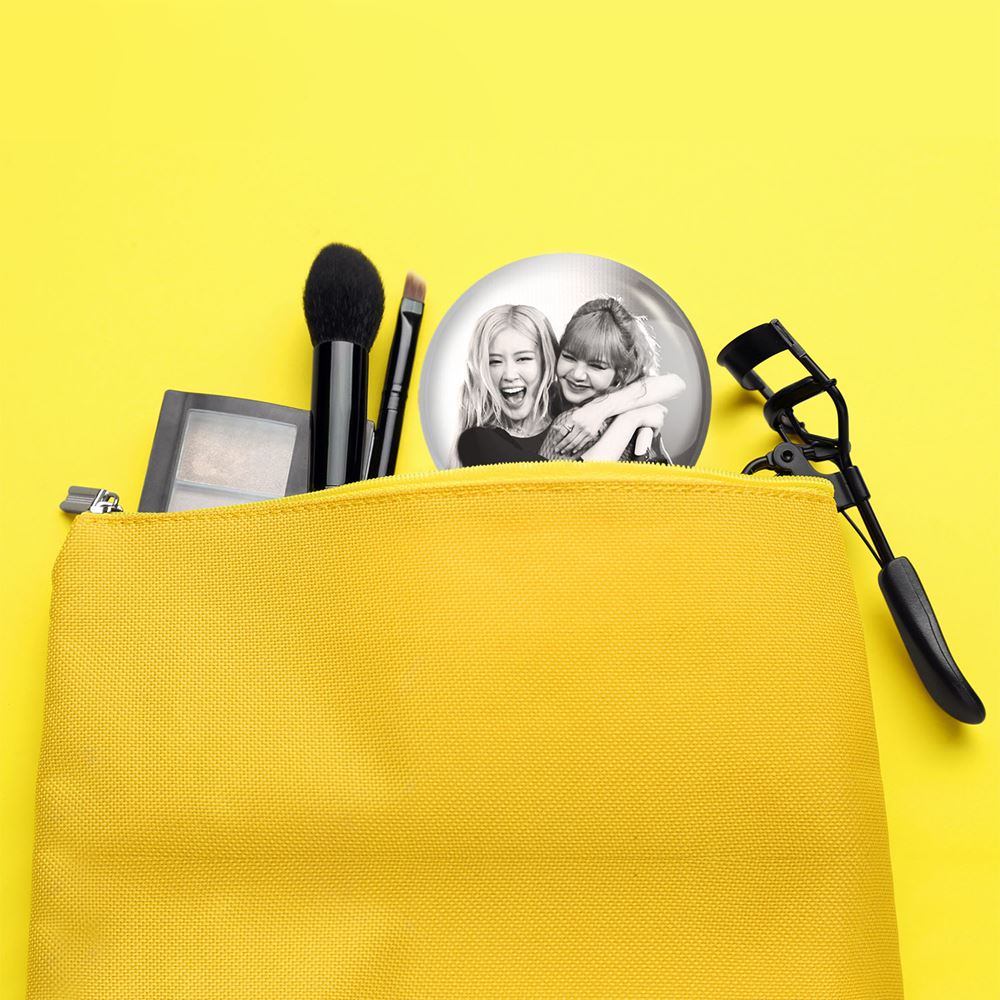 آینه های جیبی گروه بلک پینک Black Pink خندالو دایره ای به قطر 7.5 سانتی متر می باشد که نه خیلی بزرگ و غیر قابل استفاده در کیف آرایشی ست و نه خیلی کوچک که تصویر خاصی در آن مشاهده نشود. سایزی استاندارد و کارآمد دارد و مناسب قرار گیری در کیف لوازم آرایش و کیف های کوچک دستی نیز هست.