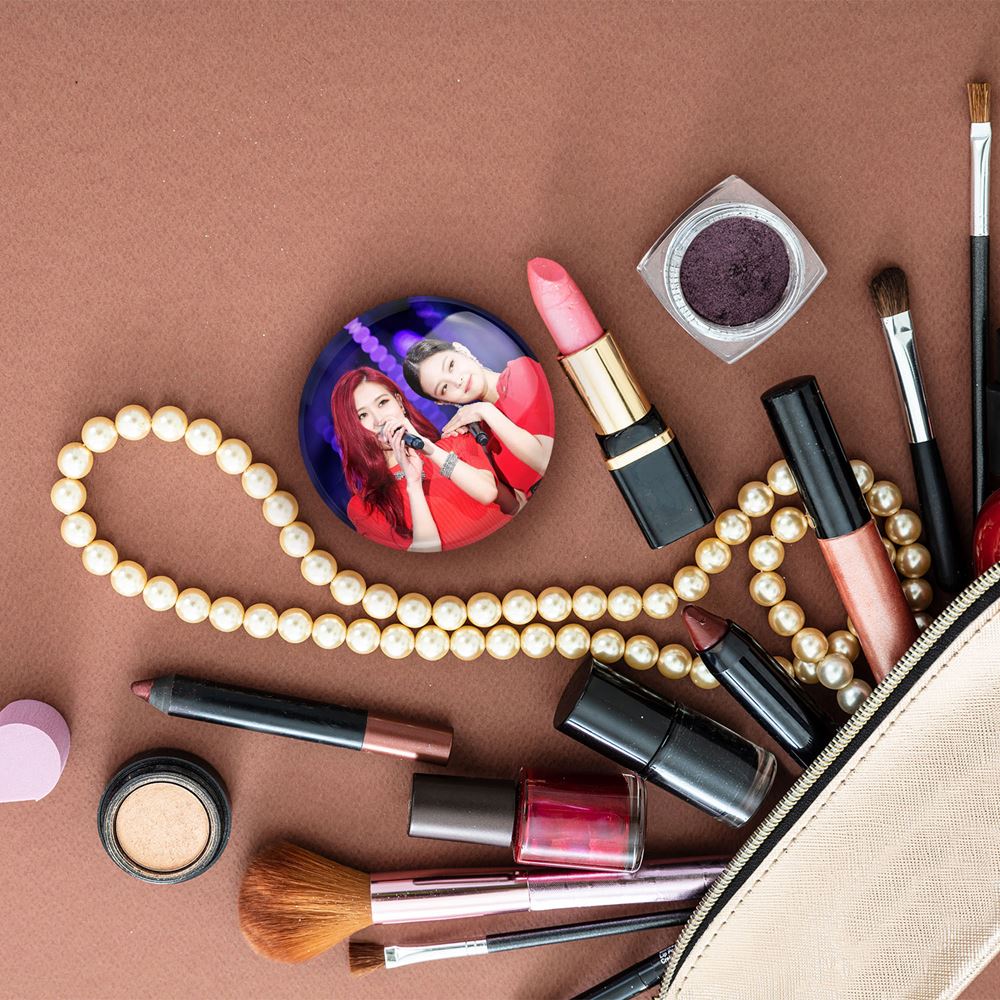 آینه های جیبی گروه بلک پینک Black Pink خندالو دایره ای به قطر 7.5 سانتی متر می باشد که نه خیلی بزرگ و غیر قابل استفاده در کیف آرایشی ست و نه خیلی کوچک که تصویر خاصی در آن مشاهده نشود. سایزی استاندارد و کارآمد دارد و مناسب قرار گیری در کیف لوازم آرایش و کیف های کوچک دستی نیز هست.