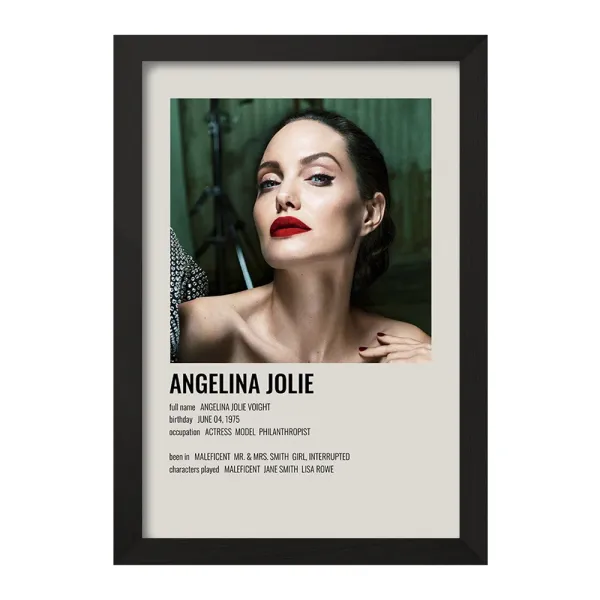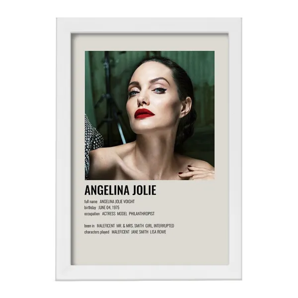 تابلو یا قاب عکس آنجلینا جولی (Angelina Jolie) خندالو در ابعاد مختلف با استفاده از بهترین برند پروفیل پی وی سی دو سانتی متری بسیار مرغوب، تولید شده اند و در مونتاژ و نصب آنها نهایت دقت در قرارگیری هر چه دقیق تر لبه ها به یکدیگر صورت گرفته است. همچنین در پشت قاب ها گیره ای برای اتصال راحت به دیوار تعبیه شده است.