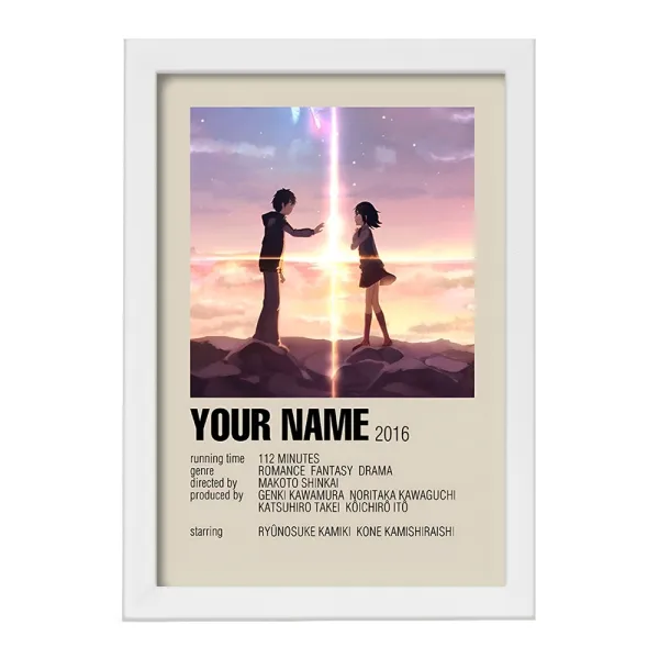 تابلو یا قاب عکس انیمه اسم تو (Your Name) خندالو در ابعاد مختلف با استفاده از بهترین برند پروفیل پی وی سی دو سانتی متری بسیار مرغوب، تولید شده اند و در مونتاژ و نصب آنها نهایت دقت در قرارگیری هر چه دقیق تر لبه ها به یکدیگر صورت گرفته است. همچنین در پشت قاب ها گیره ای برای اتصال راحت به دیوار تعبیه شده است. چاپ طرح تابلوی انیمه اسم تو (Your Name) با بالاترین کیفیت بوسیله چاپگرهای دیجیتال شش رنگ و کاغذ با کیفیت عکاسی انجام شده و بر روی آن شیشه ای با کیفیت و شفاف در سطح قاب قرار گرفته که از کاغذ عکس محافظت میکند. بسته بندی تابلوها جعبه های مقاوم و محکمی بوده که علاوه بر محافظتی که از بدنه قاب می کند، ظاهر جذابی دارد و تابلوی انیمه اسم تو (Your Name) را بدل به محصولی مناسب هدیه کرده است. تابلوهای خندالو با تنوع طرحی بسیار بالا شامل تابلو های دکوراتیو قابل استفاده در اتاق کودک، محل کار و منازل می باشد که سلیقه هر مخاطبی را پوشش می دهد، ضمن اینکه امکان تعویض عکس موجود در قاب وجود داشته و می توان عکس های خانوادگی و … را نیز در آن قرار داد.