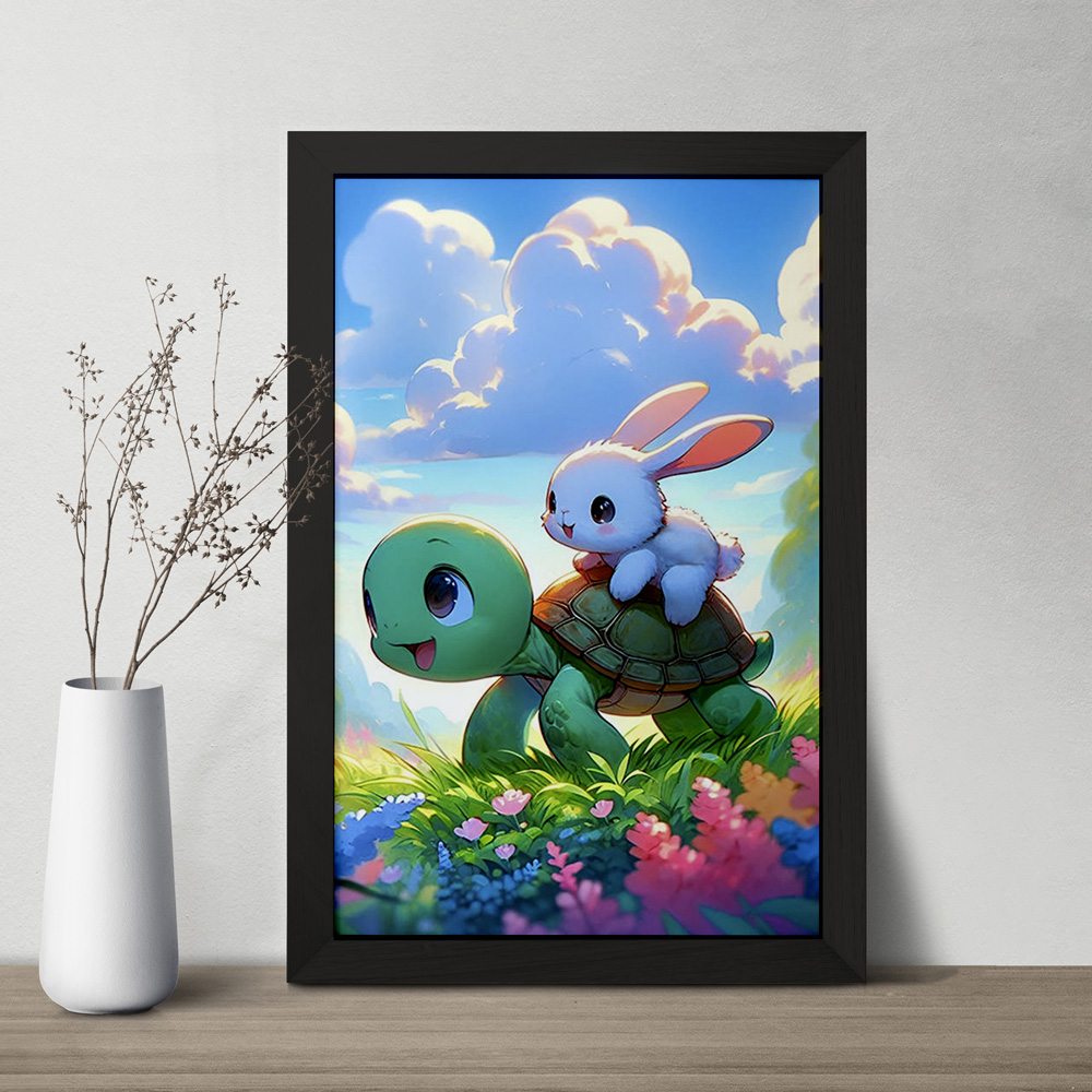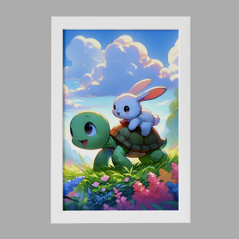 تابلو یا قاب عکس خرگوش و لاکپشت خندالو در ابعاد مختلف با استفاده از بهترین برند پروفیل پی وی سی دو سانتی متری بسیار مرغوب، تولید شده اند و در مونتاژ و نصب آنها نهایت دقت در قرارگیری هر چه دقیق تر لبه ها به یکدیگر صورت گرفته است. همچنین در پشت قاب ها گیره ای برای اتصال راحت به دیوار تعبیه شده است. چاپ طرح تابلوی خرگوش و لاکپشت با بالاترین کیفیت بوسیله چاپگرهای دیجیتال شش رنگ و کاغذ با کیفیت عکاسی انجام شده و بر روی آن شیشه ای با کیفیت و شفاف در سطح قاب قرار گرفته که از کاغذ عکس محافظت میکند. بسته بندی تابلوها جعبه های مقاوم و محکمی بوده که علاوه بر محافظتی که از بدنه قاب می کند، ظاهر جذابی دارد و تابلوی خرگوش و لاکپشت را بدل به محصولی مناسب هدیه کرده است. تابلوهای خندالو با تنوع طرحی بسیار بالا شامل تابلو های دکوراتیو قابل استفاده در اتاق کودک، محل کار و منازل می باشد که سلیقه هر مخاطبی را پوشش می دهد، ضمن اینکه امکان تعویض عکس موجود در قاب وجود داشته و می توان عکس های خانوادگی و … را نیز در آن قرار داد.