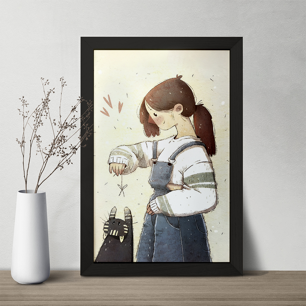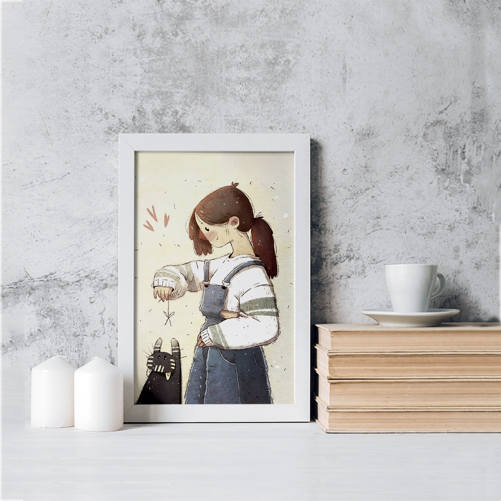 تابلو یا قاب عکس دختر و گربه خندالو در ابعاد مختلف با استفاده از بهترین برند پروفیل پی وی سی دو سانتی متری بسیار مرغوب، تولید شده اند و در مونتاژ و نصب آنها نهایت دقت در قرارگیری هر چه دقیق تر لبه ها به یکدیگر صورت گرفته است. همچنین در پشت قاب ها گیره ای برای اتصال راحت به دیوار تعبیه شده است.