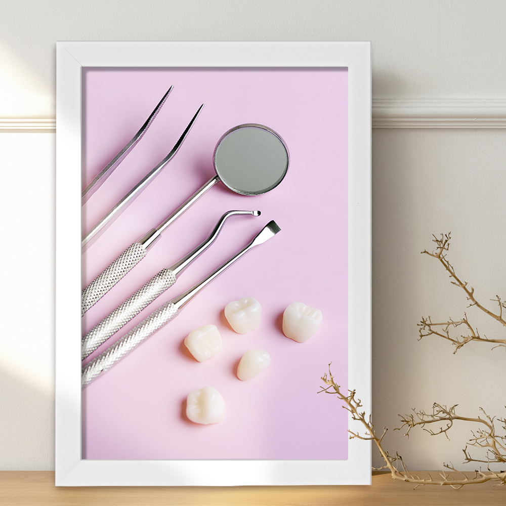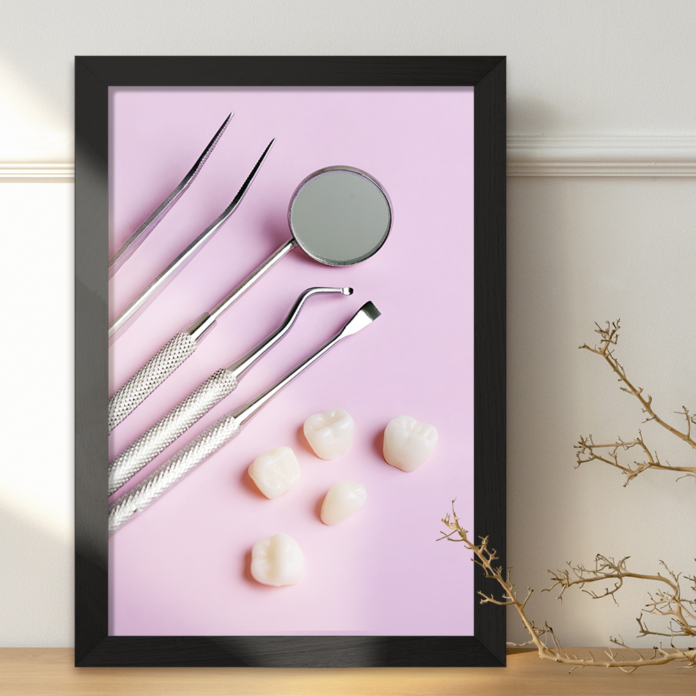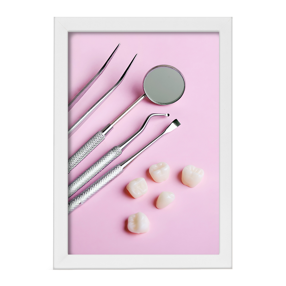 تابلو یا قاب عکس دندان و دندان پزشکی خندالو در ابعاد مختلف با استفاده از بهترین برند پروفیل پی وی سی دو سانتی متری بسیار مرغوب، تولید شده اند و در مونتاژ و نصب آنها نهایت دقت در قرارگیری هر چه دقیق تر لبه ها به یکدیگر صورت گرفته است. همچنین در پشت قاب ها گیره ای برای اتصال راحت به دیوار تعبیه شده است.