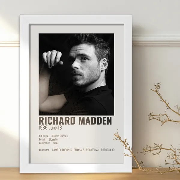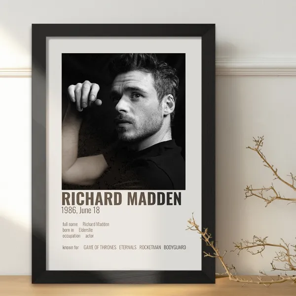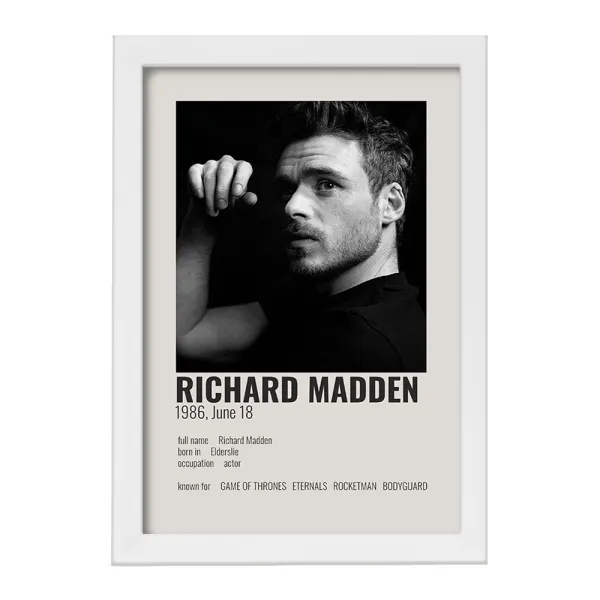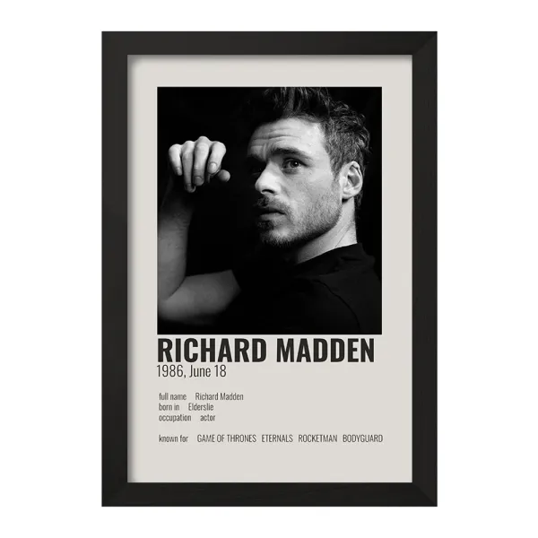 تابلو یا قاب عکس ریچارد مدن (Richard Madden) خندالو در ابعاد مختلف با استفاده از بهترین برند پروفیل پی وی سی دو سانتی متری بسیار مرغوب، تولید شده اند و در مونتاژ و نصب آنها نهایت دقت در قرارگیری هر چه دقیق تر لبه ها به یکدیگر صورت گرفته است. همچنین در پشت قاب ها گیره ای برای اتصال راحت به دیوار تعبیه شده است. چاپ طرح تابلوی ریچارد مدن (Richard Madden) با بالاترین کیفیت بوسیله چاپگرهای دیجیتال شش رنگ و کاغذ با کیفیت عکاسی انجام شده و بر روی آن شیشه ای با کیفیت و شفاف در سطح قاب قرار گرفته که از کاغذ عکس محافظت میکند. بسته بندی تابلوها جعبه های مقاوم و محکمی بوده که علاوه بر محافظتی که از بدنه قاب می کند، ظاهر جذابی دارد و تابلوی ریچارد مدن (Richard Madden) را بدل به محصولی مناسب هدیه کرده است. تابلوهای خندالو با تنوع طرحی بسیار بالا شامل تابلو های دکوراتیو قابل استفاده در اتاق کودک، محل کار و منازل می باشد که سلیقه هر مخاطبی را پوشش می دهد، ضمن اینکه امکان تعویض عکس موجود در قاب وجود داشته و می توان عکس های خانوادگی و … را نیز در آن قرار داد.